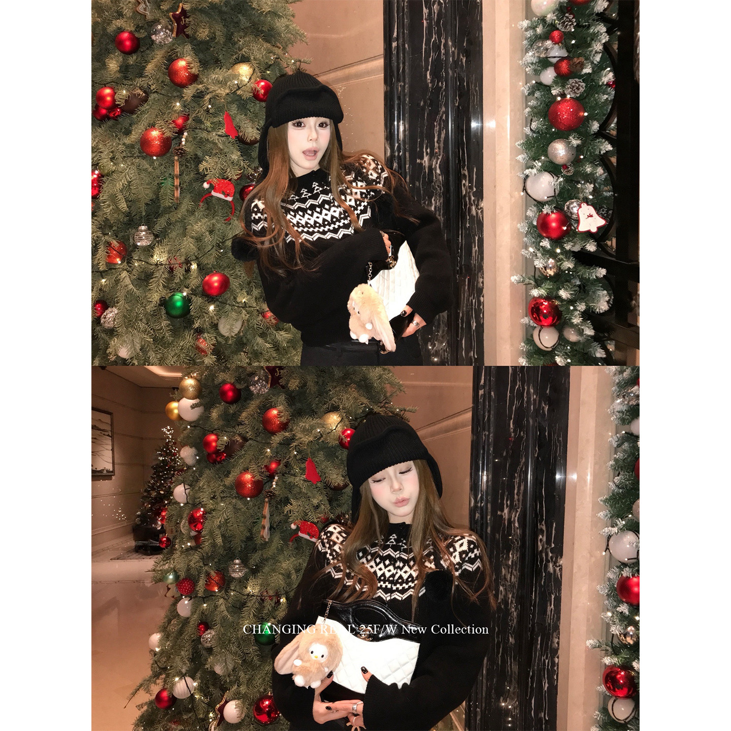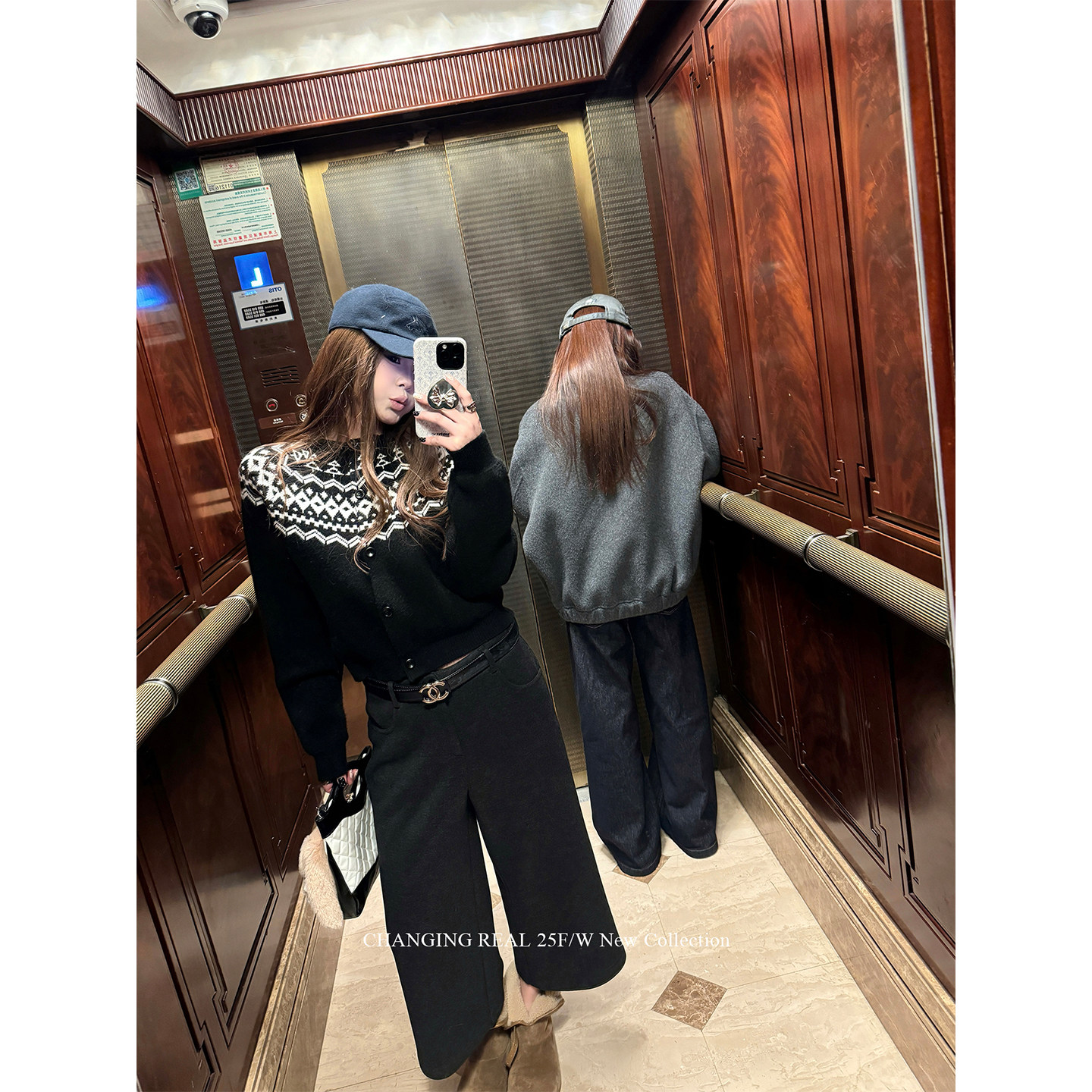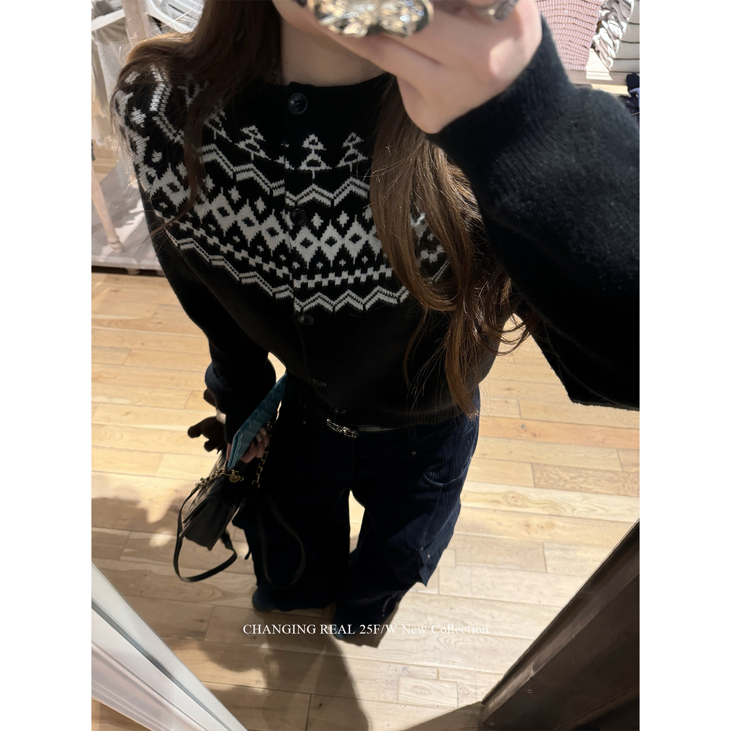 CHANGING REAL 佩里画廊 黑白撞色费尔岛毛衣女短款针织开衫外套