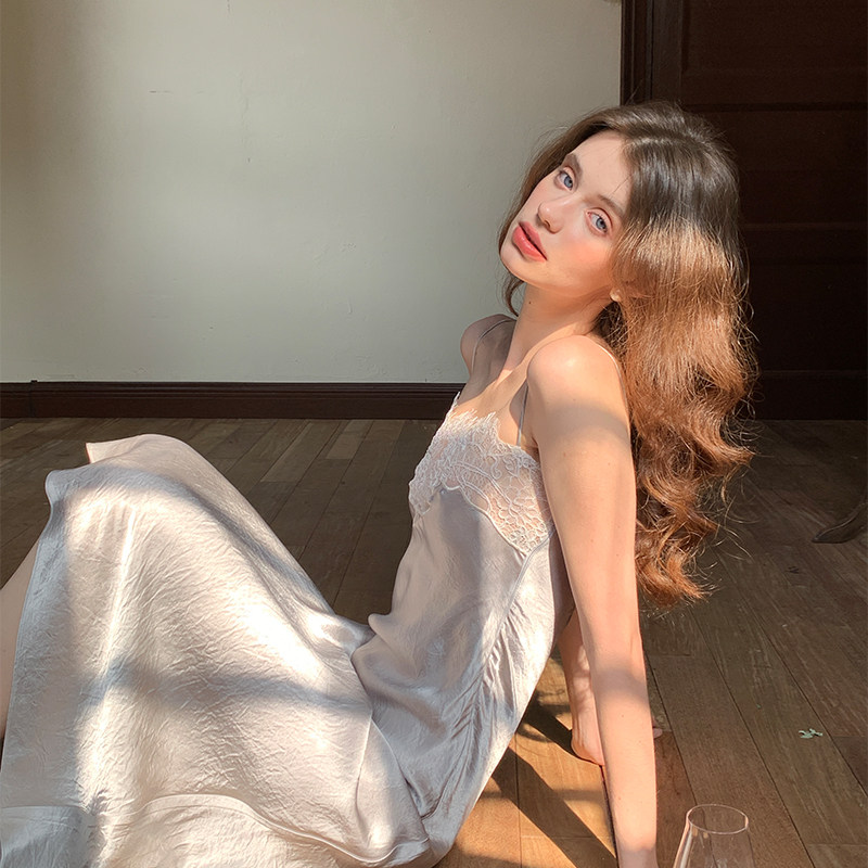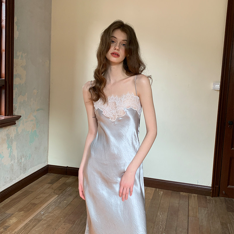 ZHUYIYI 蕾丝拼接100醋酸修身吊带连衣裙女夏高级感收腰修身显瘦