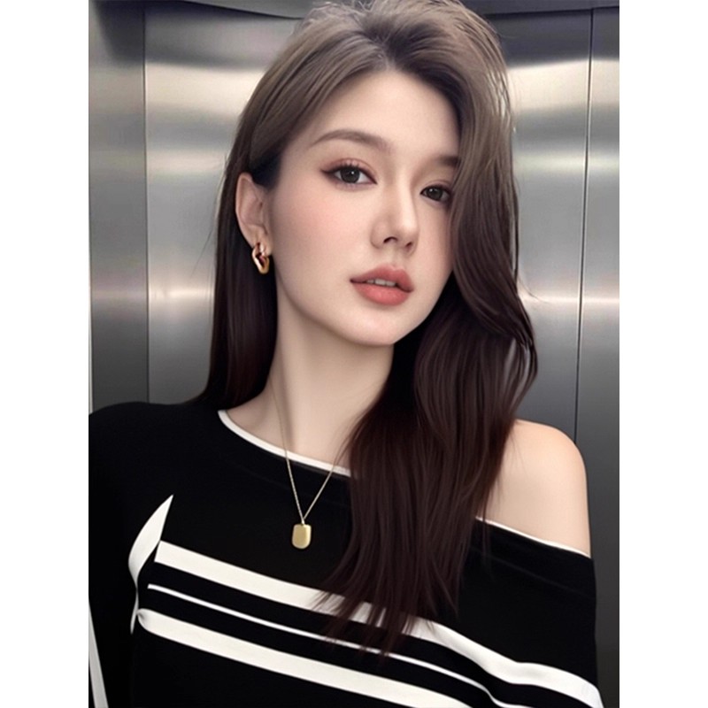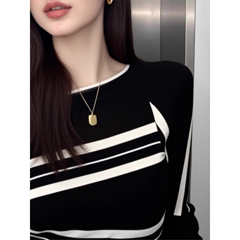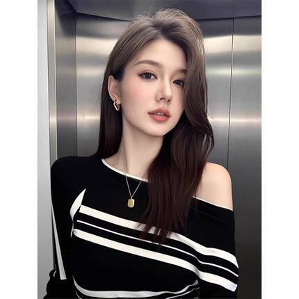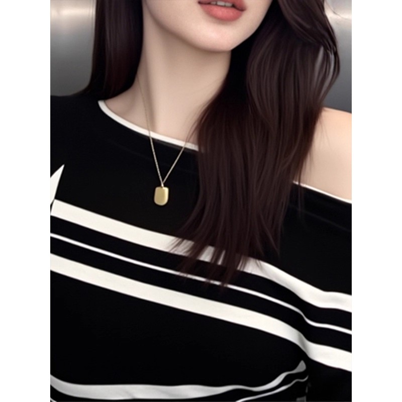 早秋法式新款条纹斜肩长袖t恤女高级设计感小众修身显瘦露肩上衣