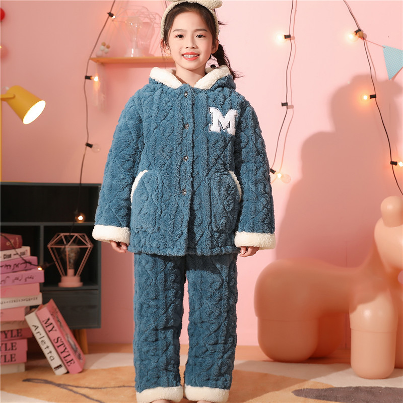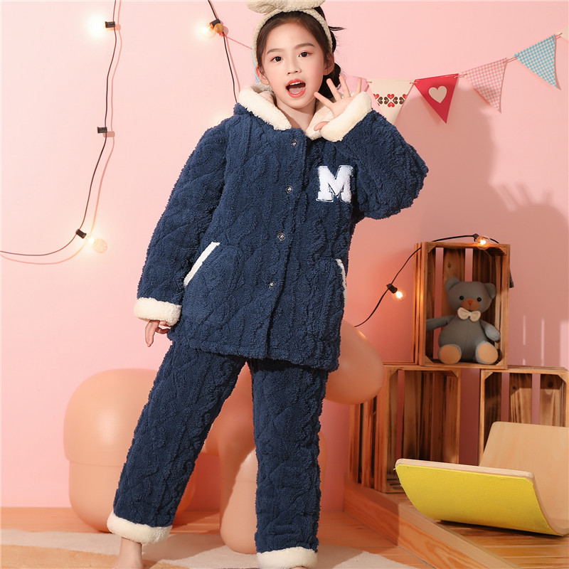 冬季小孩男孩宝宝儿童睡衣夹棉三层男童女童中大童加厚法兰绒套装
