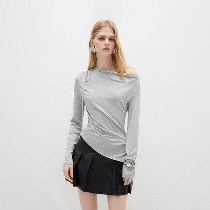 绫致ONLY2025夏季新款纯色一字荡领不规则下摆长袖T恤女