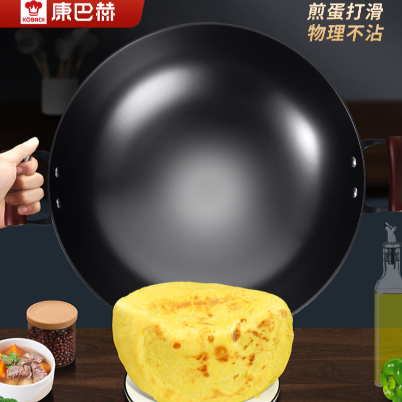 康巴赫铁锅铸铁锅炒锅加深老式圆底双耳大炒锅无涂层燃气用大