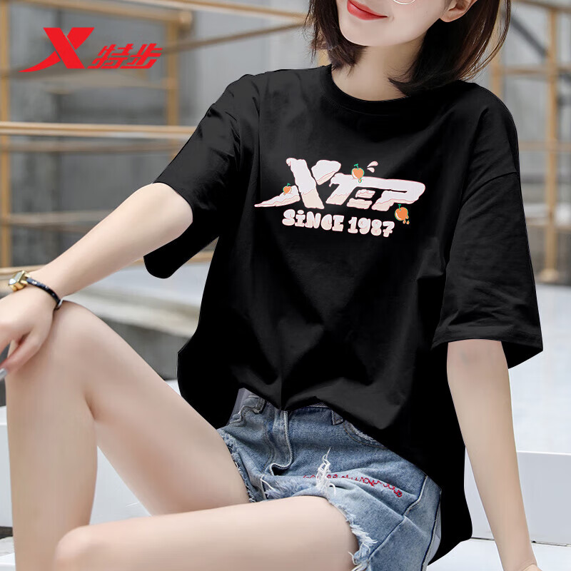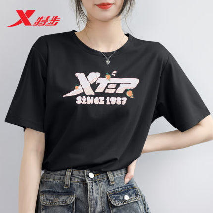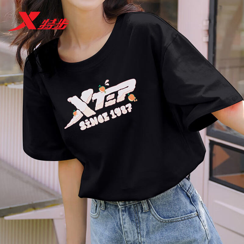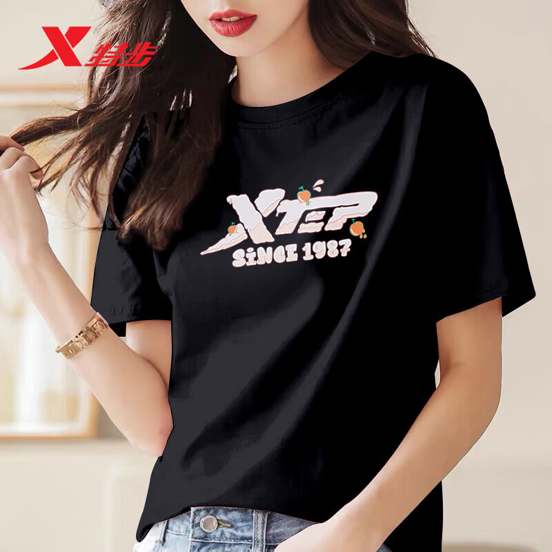 特步半袖透气短袖黑色T恤2025秋季新款运动上衣官方旗舰正品女装