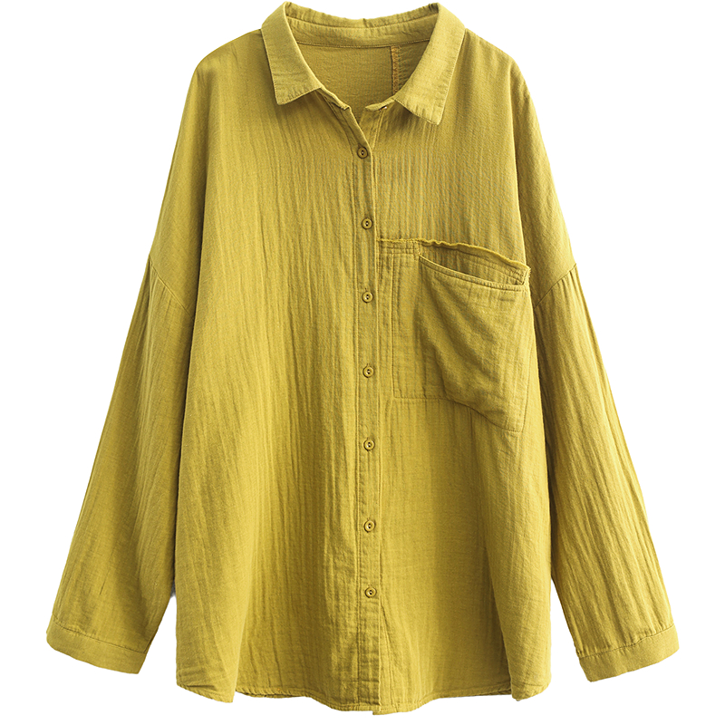 绿素棉 慵懒复古风双纱棉麻衬衫~中长款 大码女装休闲风显瘦衬衣