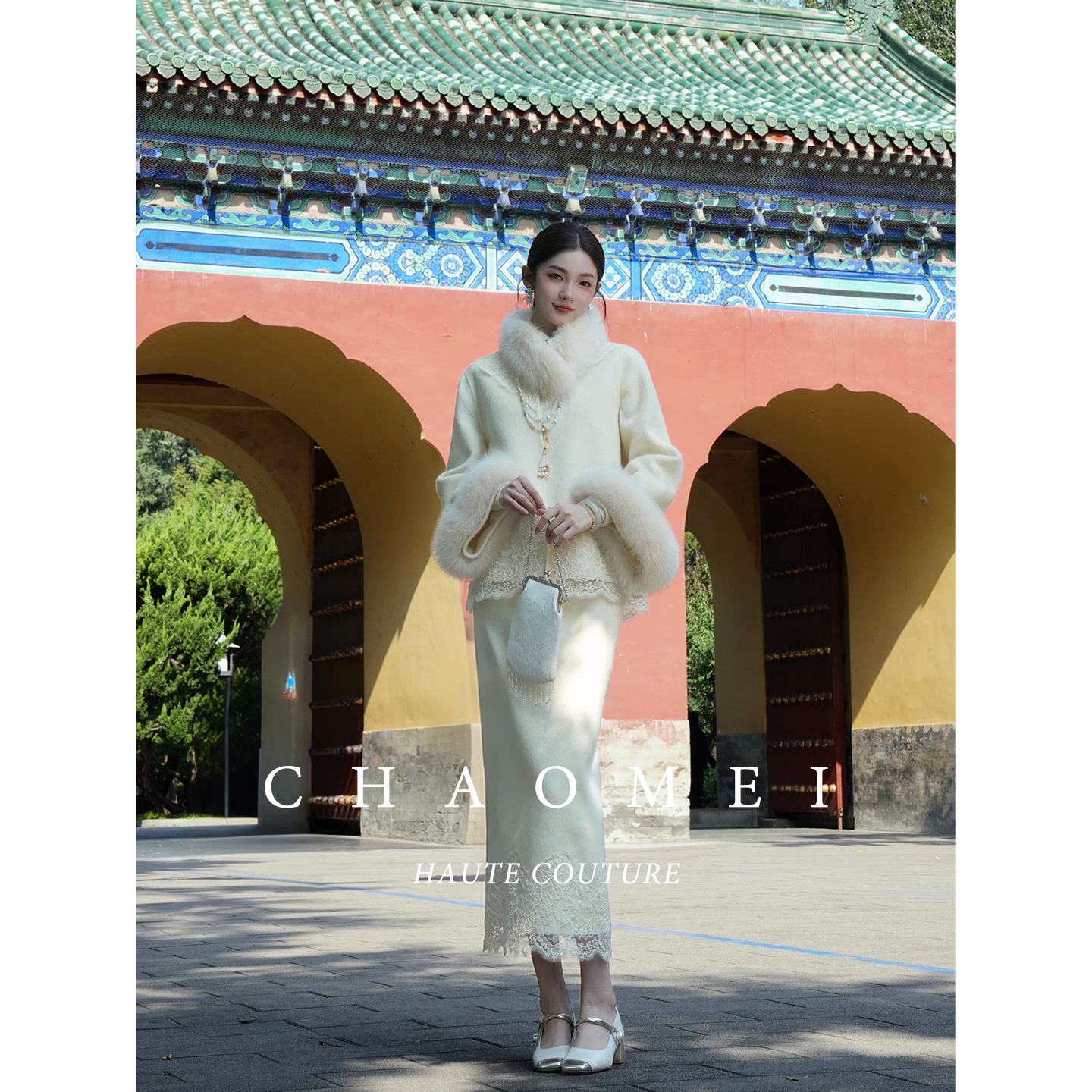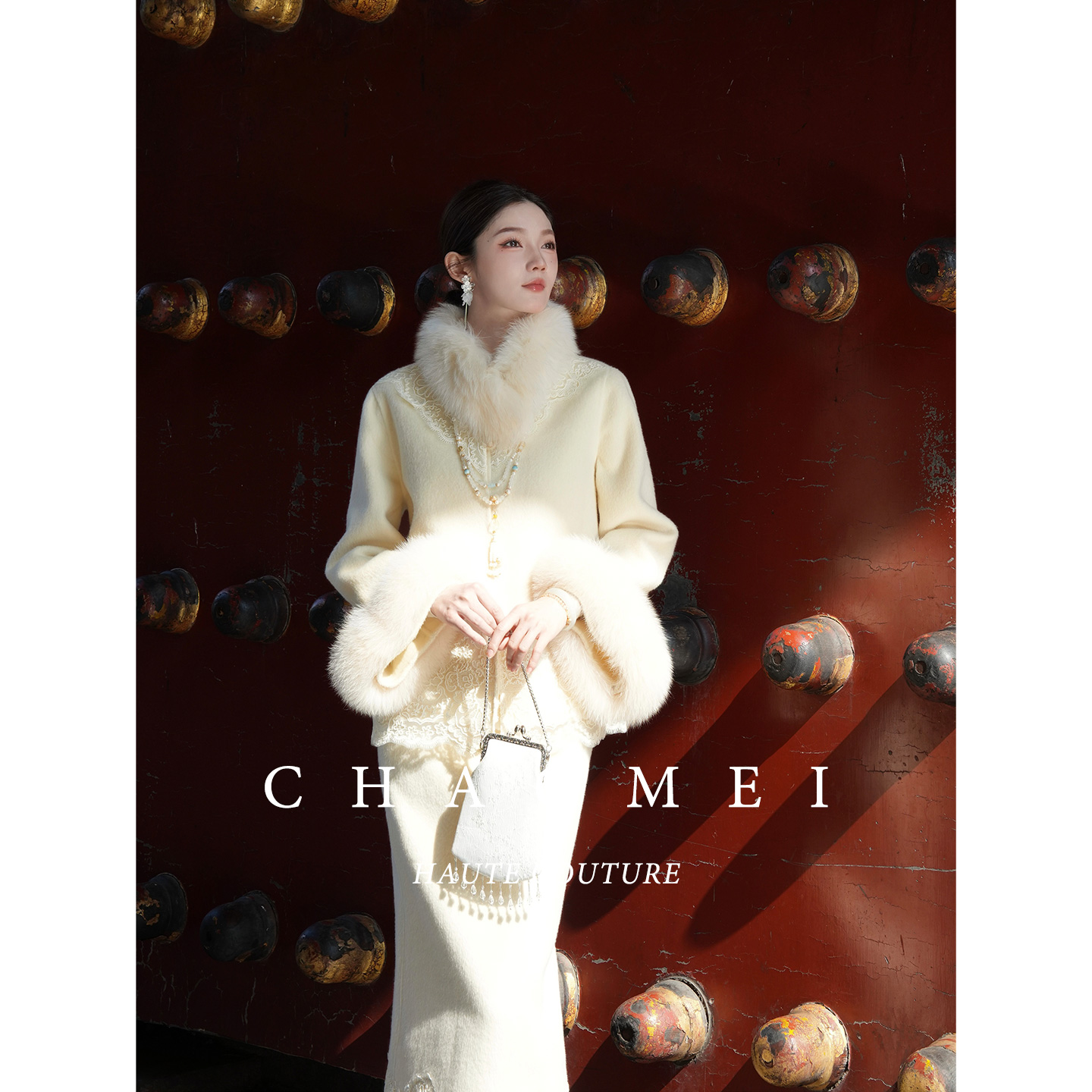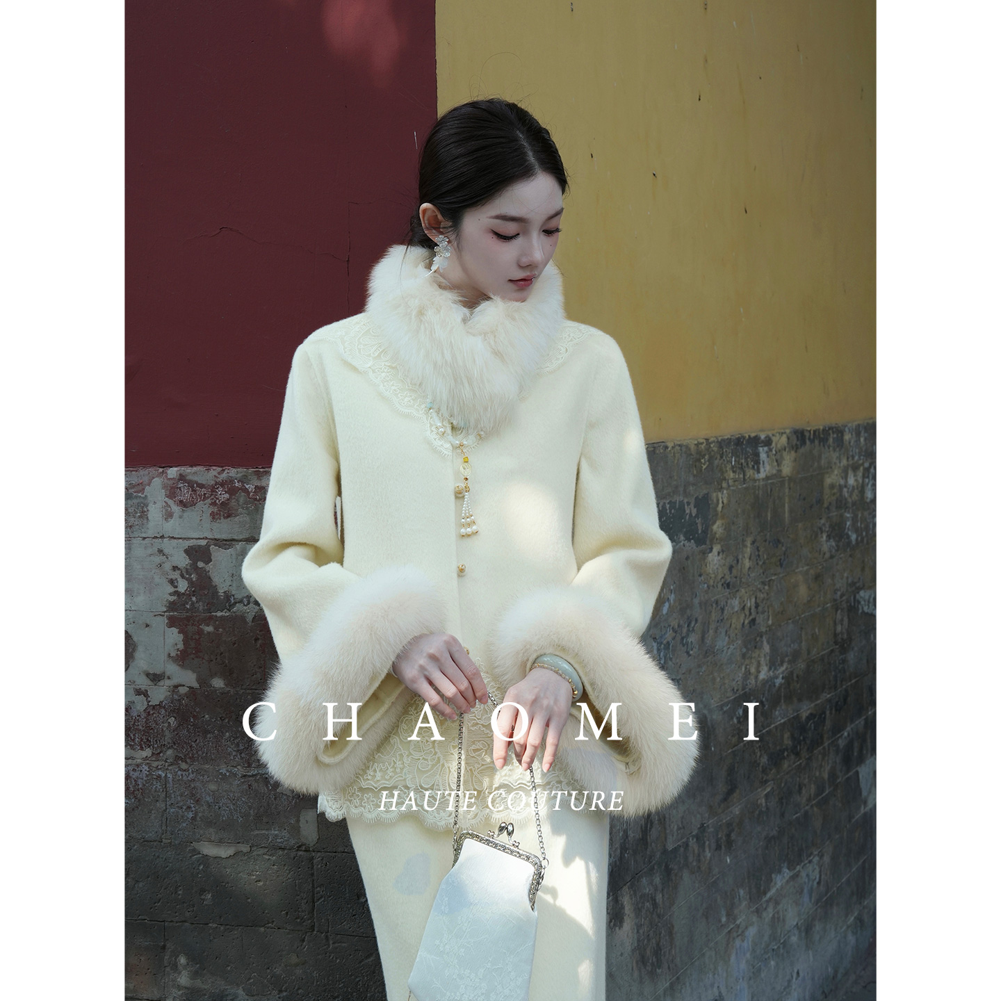 冯(CHAOMEI 【贵女】新中式国风狐狸毛领刺绣外套羊毛呢套装