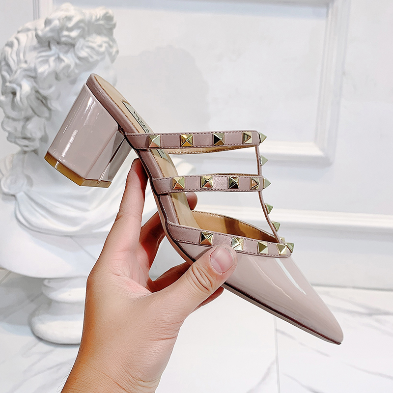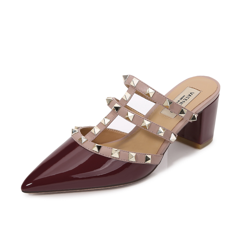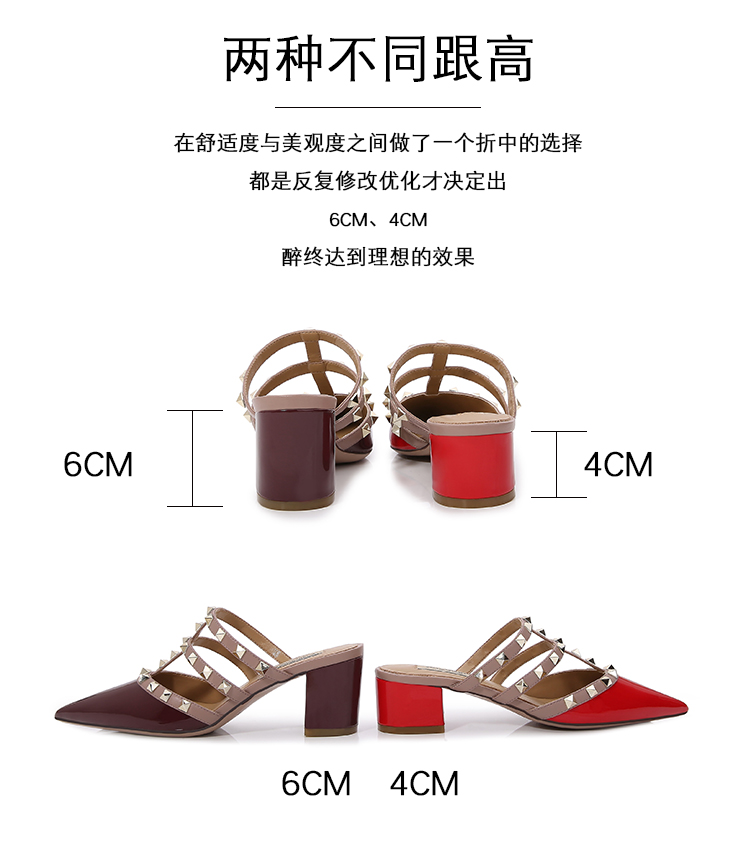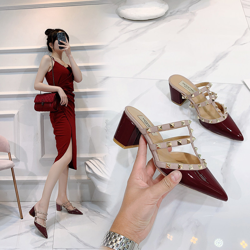 2024新款铆钉高跟鞋凉拖鞋女外穿红色粗跟包头凉鞋夏季尖头单鞋