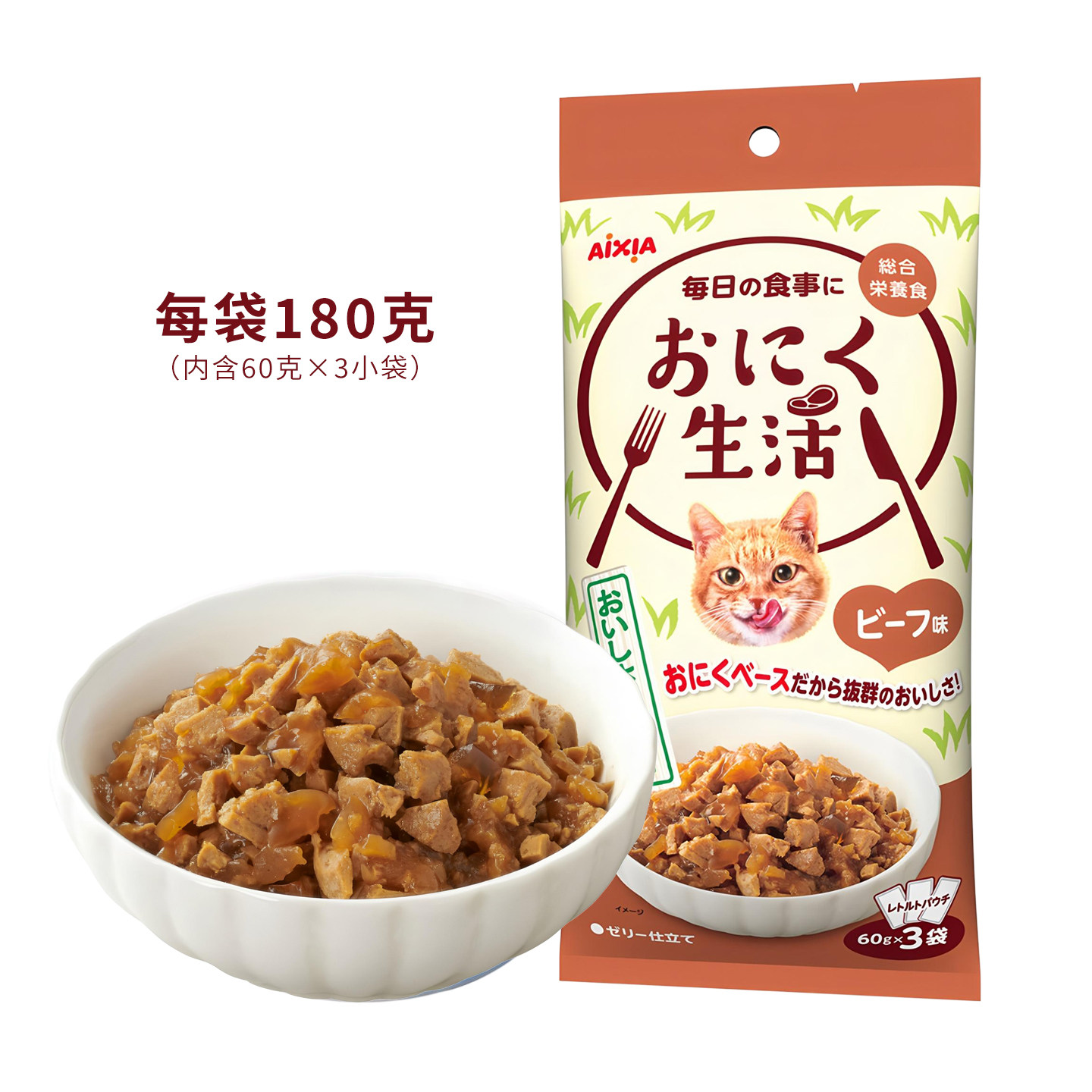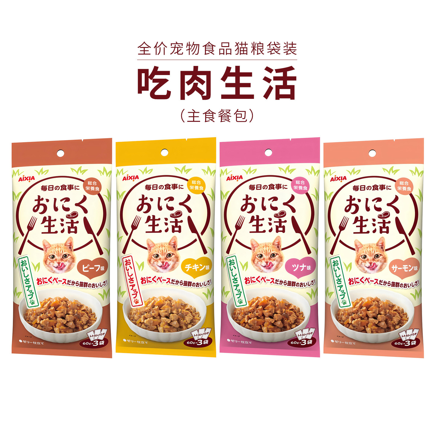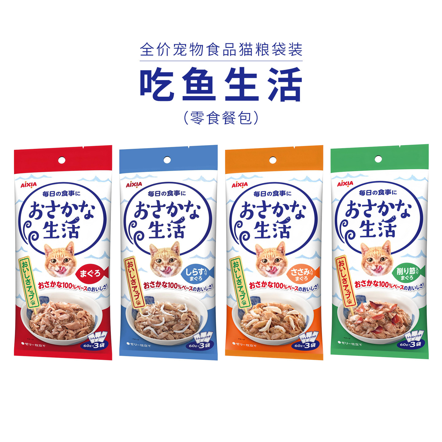 日本AIXIA爱喜雅吃鱼生活猫零食湿粮全价主食餐包金枪鱼牛肉鸡4袋