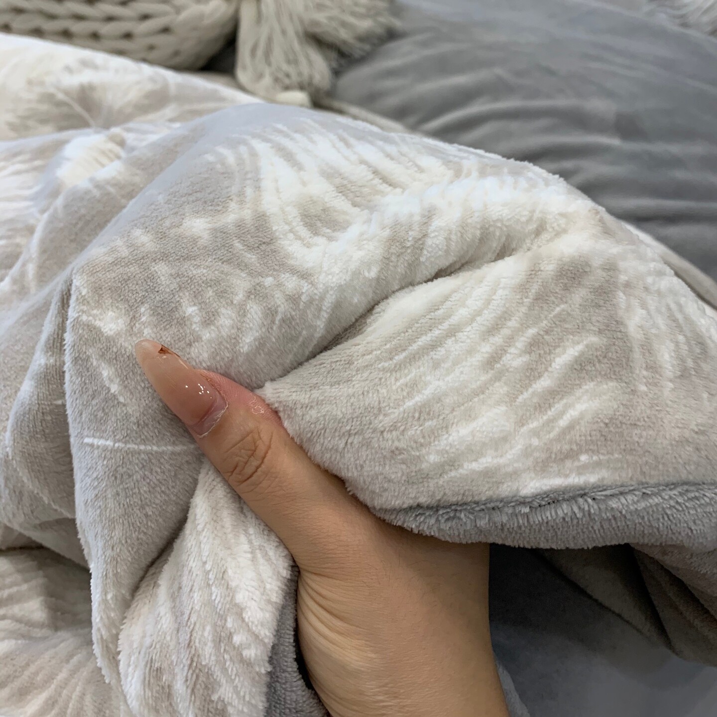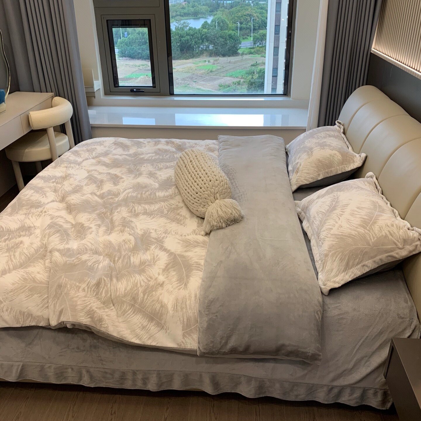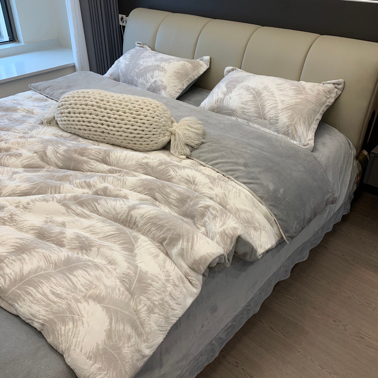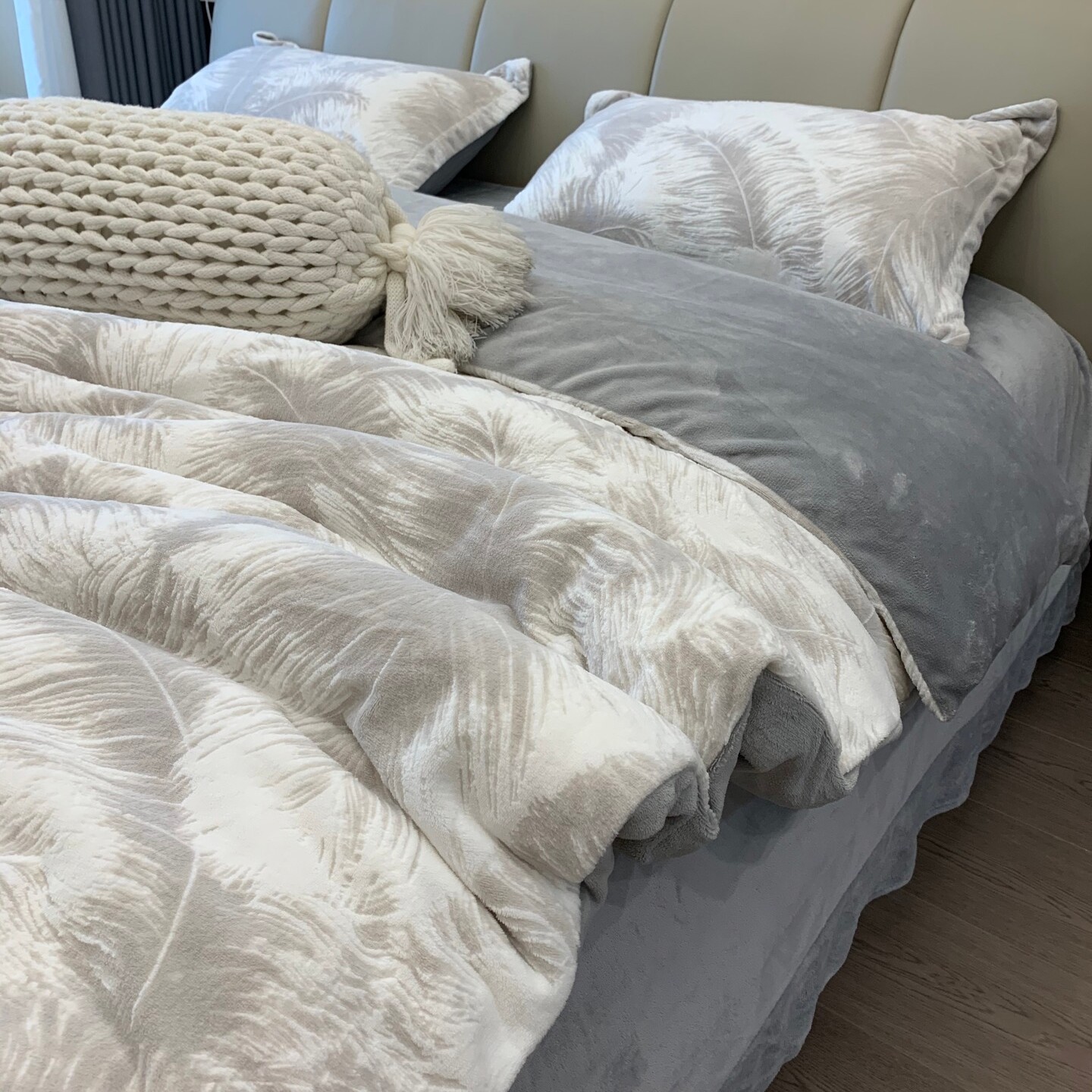 2025新款冬季雕花牛奶绒床上四件套高级灰羽毛珊瑚绒被套加绒床单