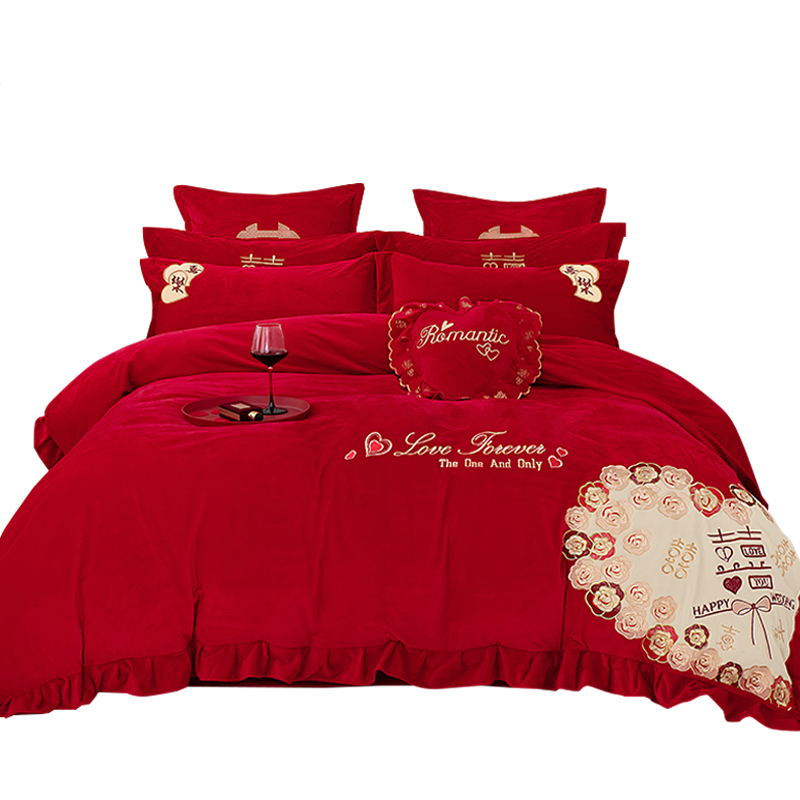 牛奶绒结婚四件套冬季珊瑚绒红色婚庆床上用品加厚花边款被套床单