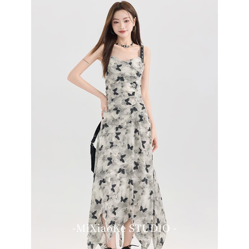 芈小可法式水墨画碎花吊带连衣裙女夏季气质长裙不规则裙子小个子