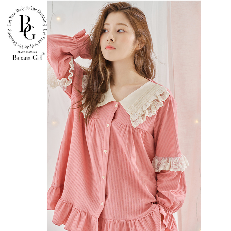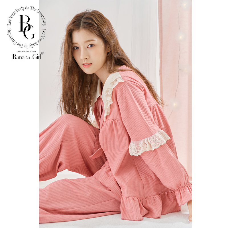 香蕉女孩睡衣女长袖纯棉女士蕾丝甜美可爱娃娃领开衫家居服套装
