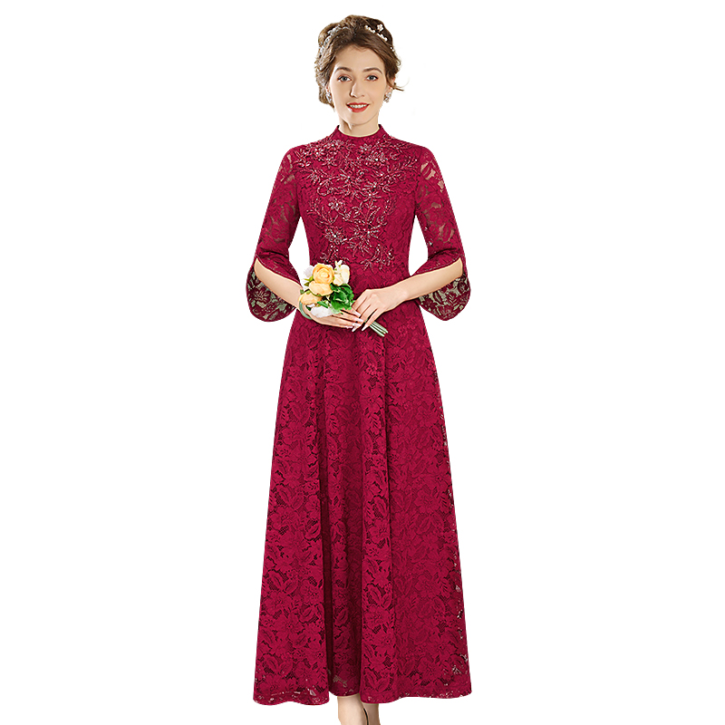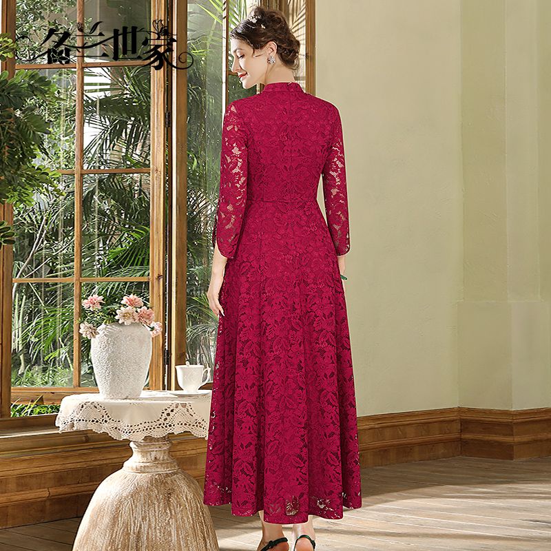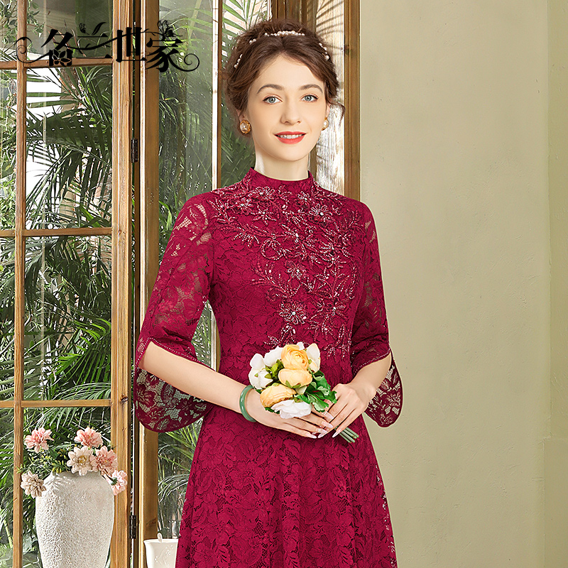 名兰世家2025年新品设计师高端礼服裙小立领蕾丝红色气质连衣裙
