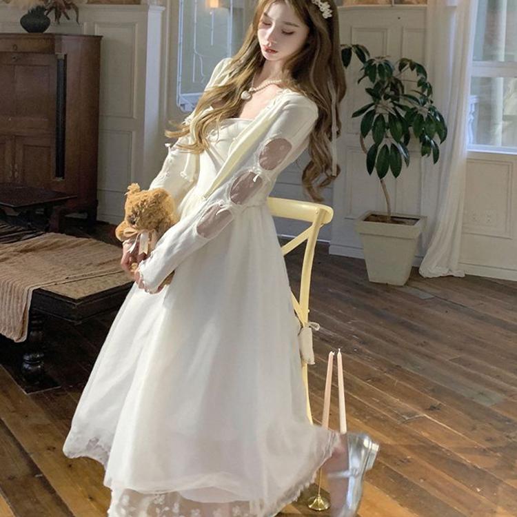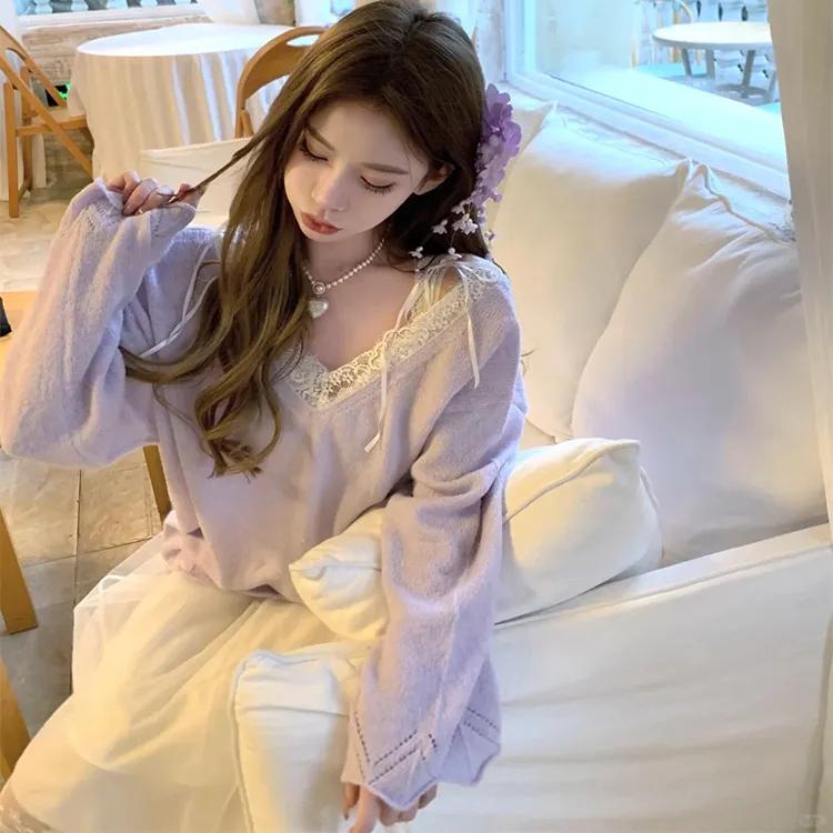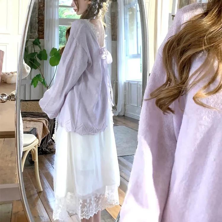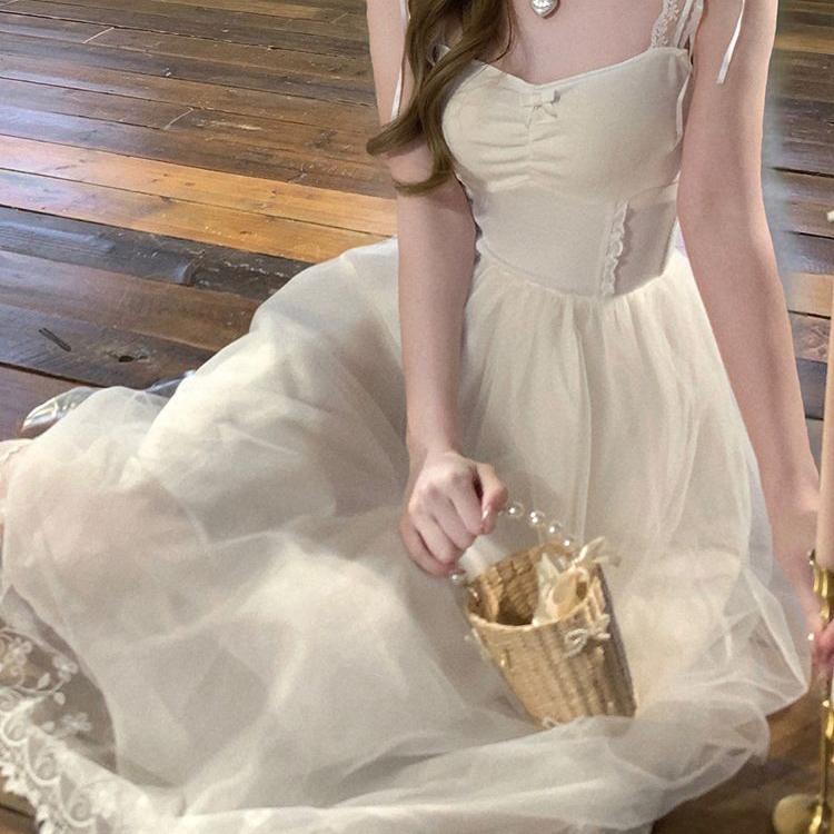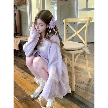 2025春季新款温柔甜美蕾丝拼接针织上衣+收腰显瘦吊带长裙两件套