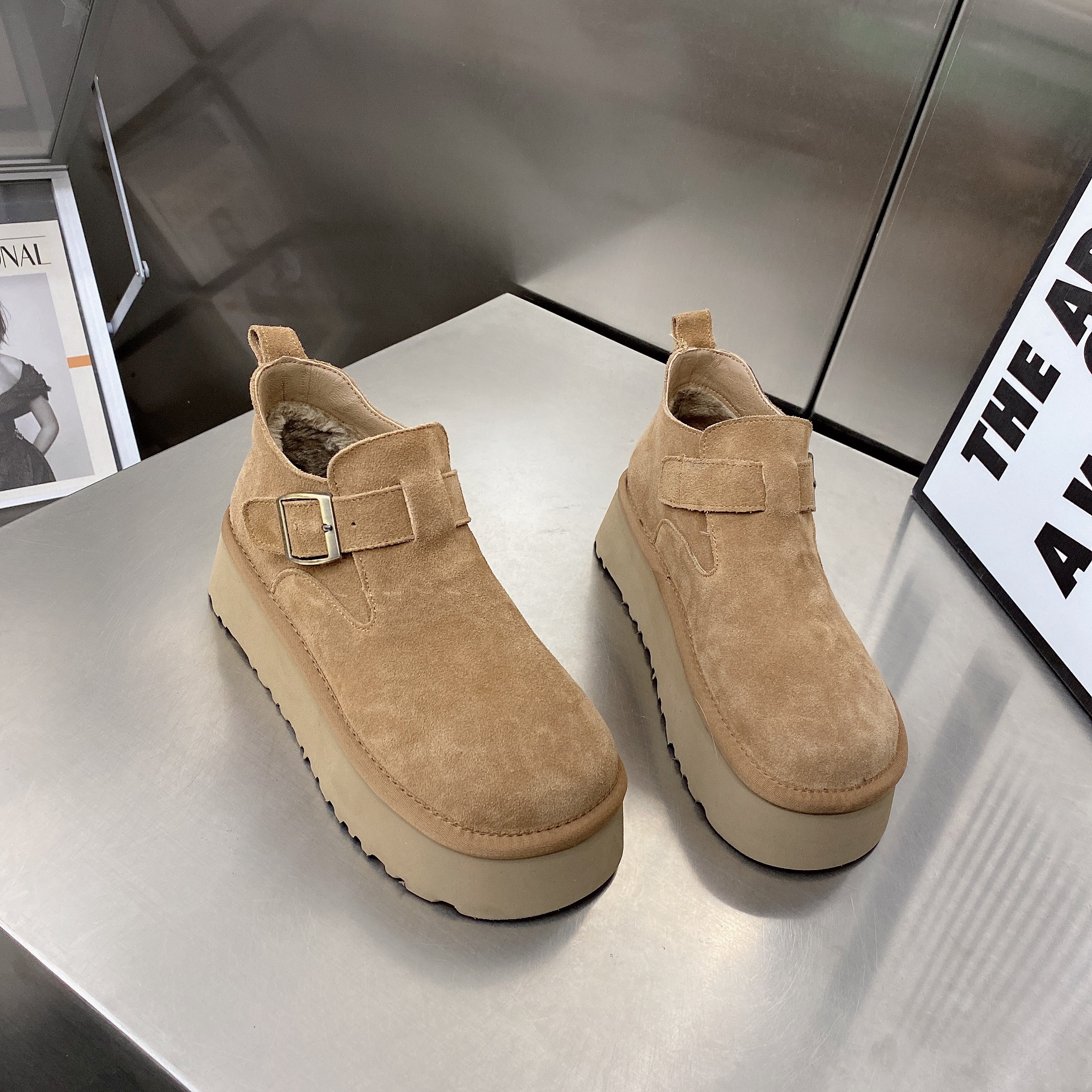 翻毛皮真皮松糕厚底面包鞋女加绒雪地棉鞋网红爆款皮带搭扣休闲鞋