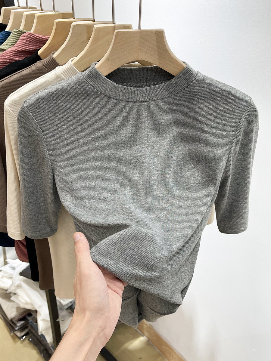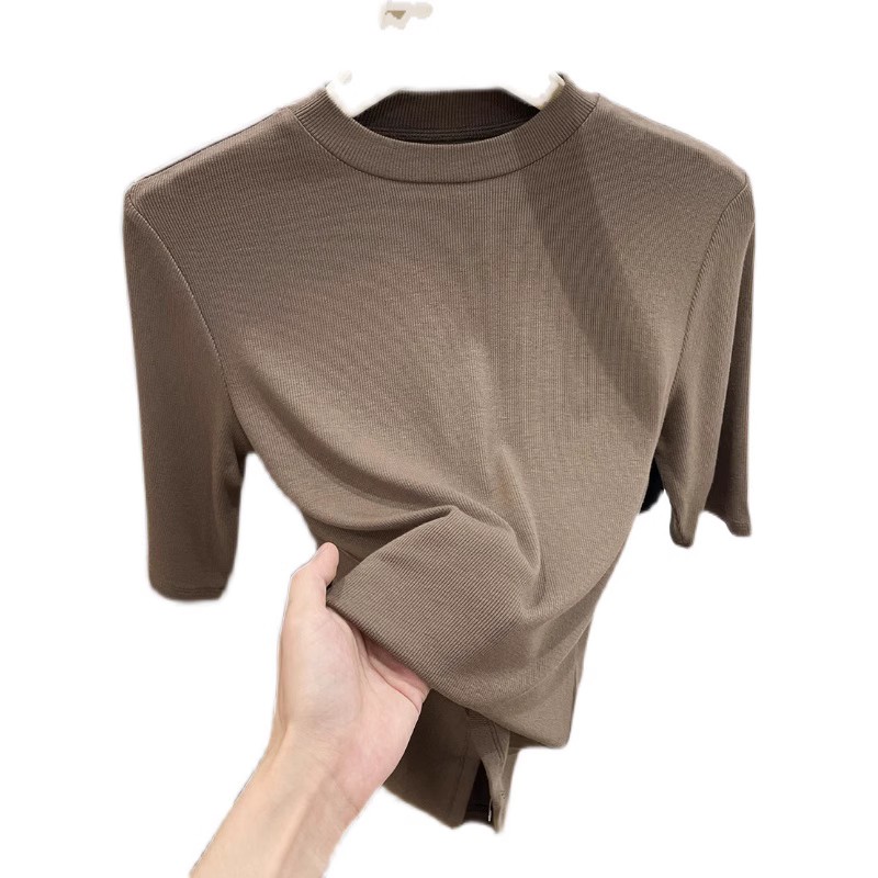 欧货螺纹五分袖t恤女2023新款早秋修身中袖半高领打底小衫上衣薄