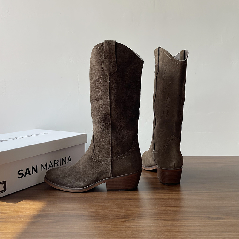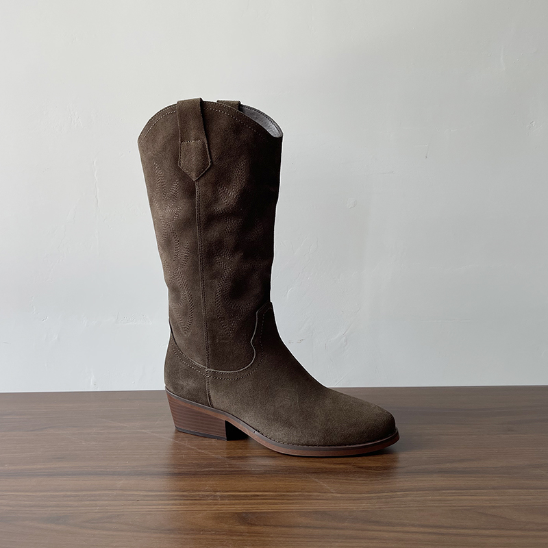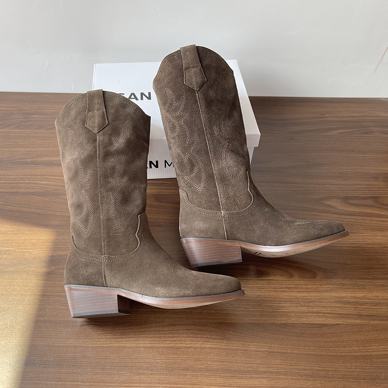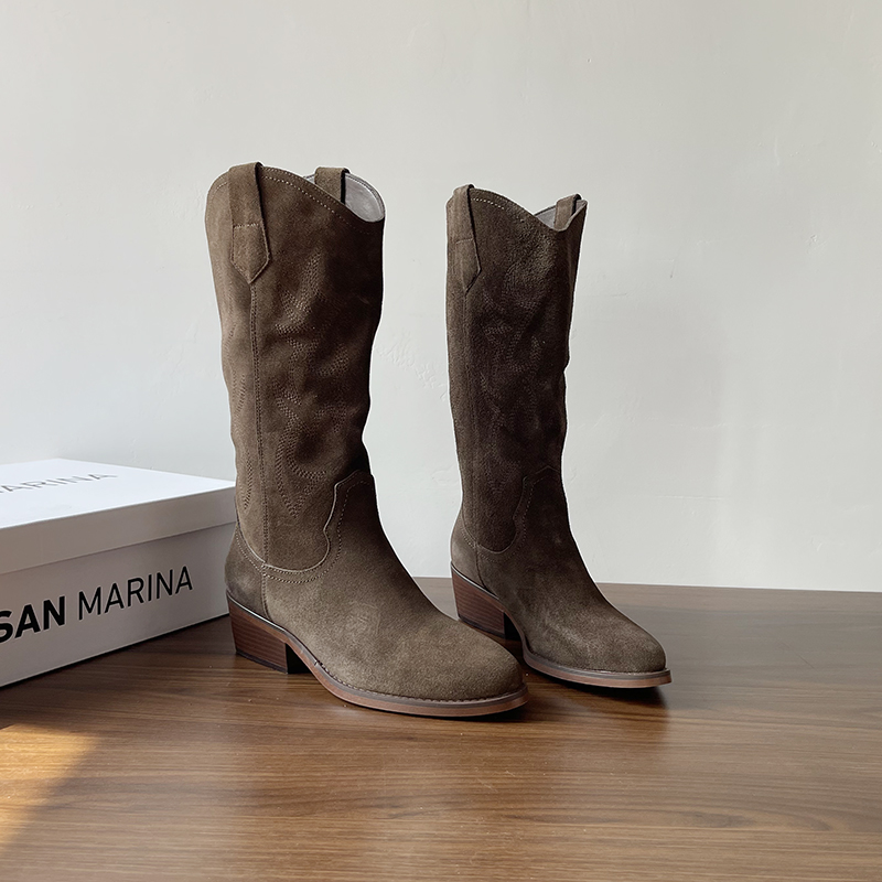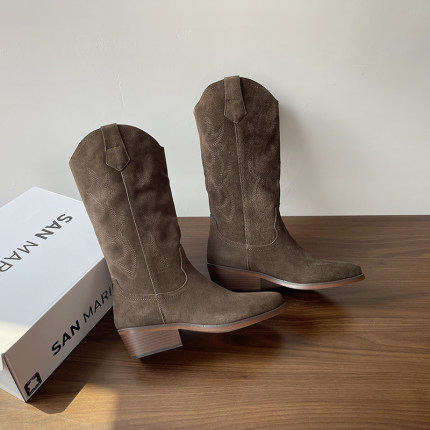 美拉德外贸真皮西部牛仔靴女2025粗跟中筒靴子复古尖头骑士靴女靴