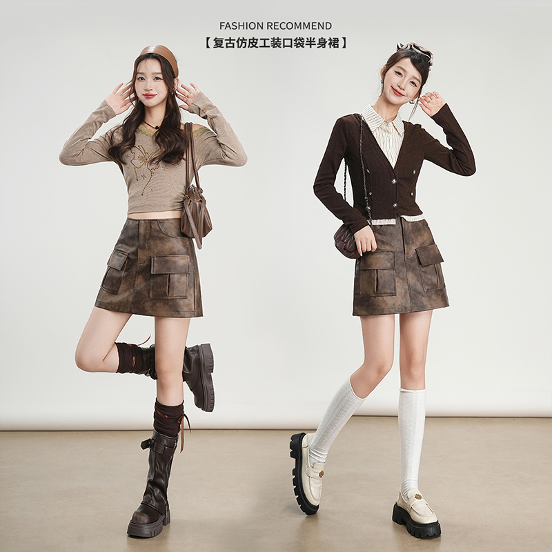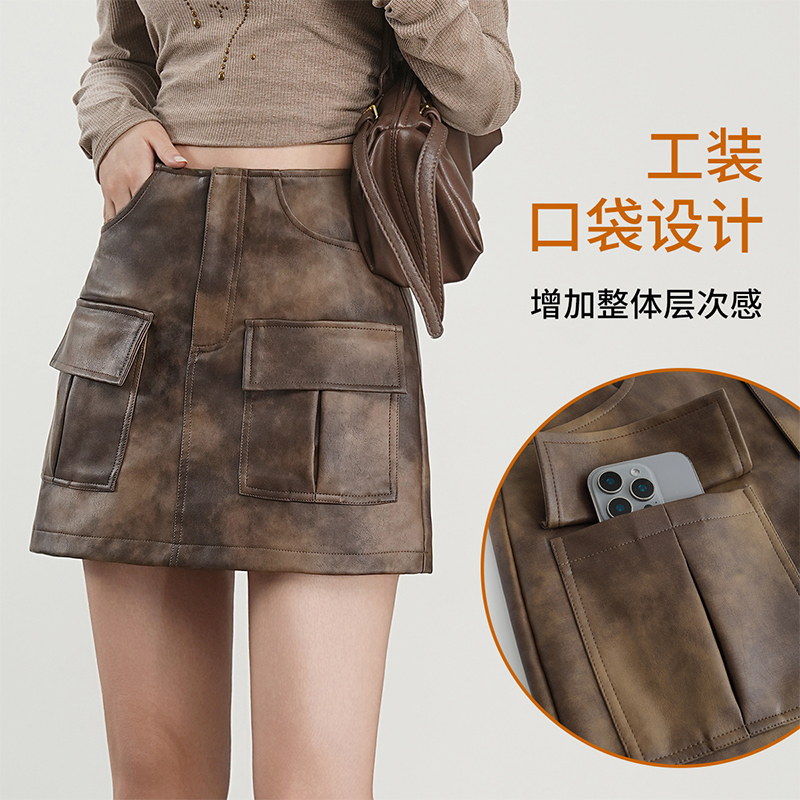 白鹿语美式辣妹仿皮工装半身裙25秋冬新款高腰显瘦百搭包臀短裙