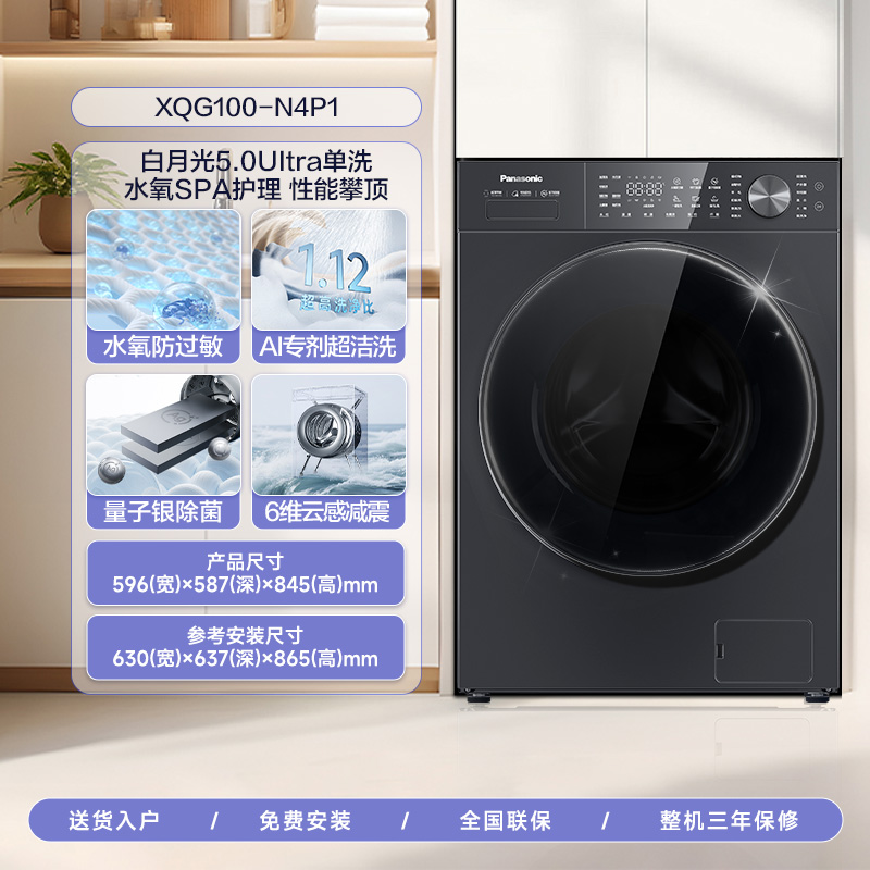 [白月光5.0Ultra]松下10kg全自动滚筒洗衣机除菌水氧防过敏 N4P1