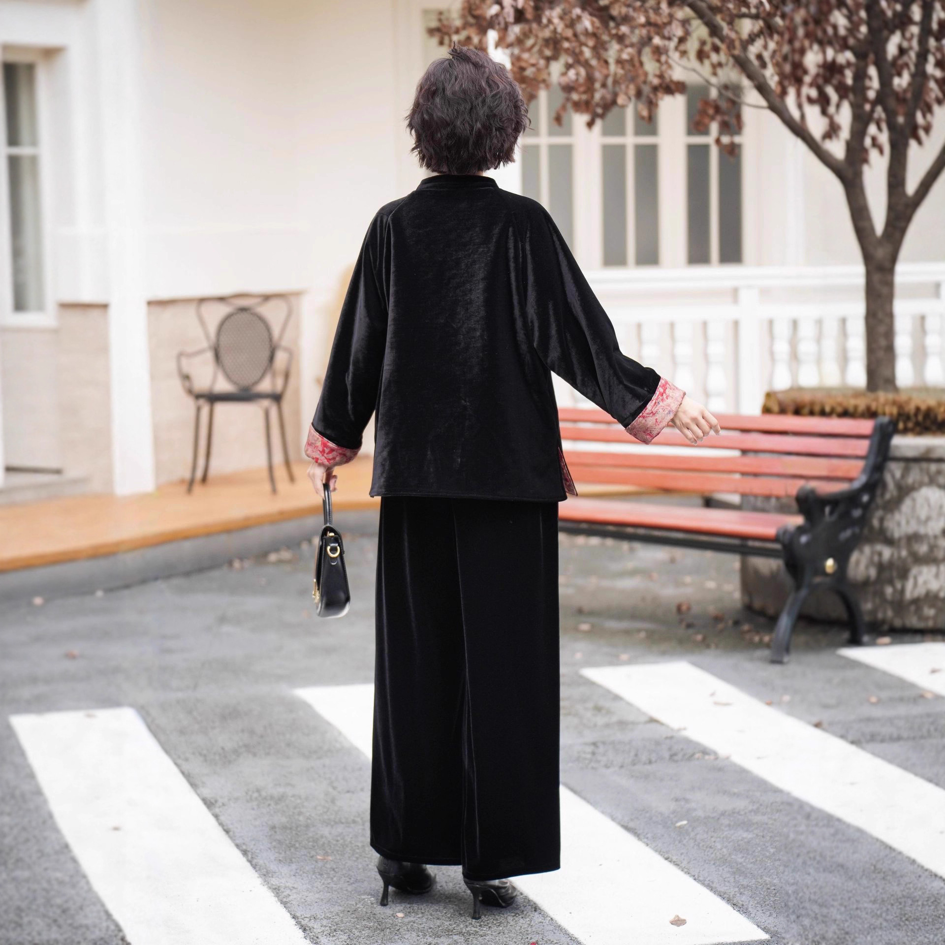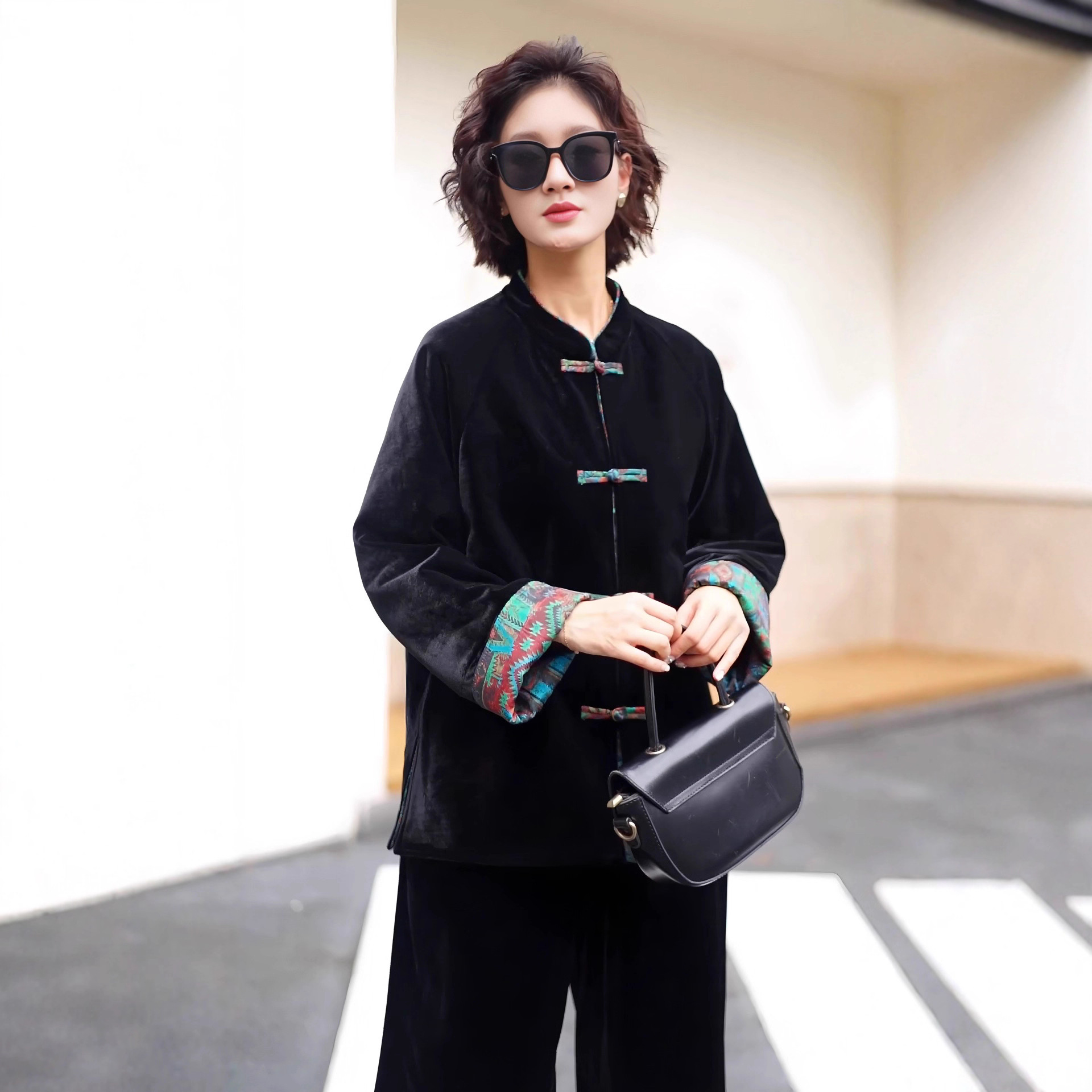 大码新中式国风上衣女秋冬丝绒唐装薄棉衣宽松阔腿裤夹棉两件套装