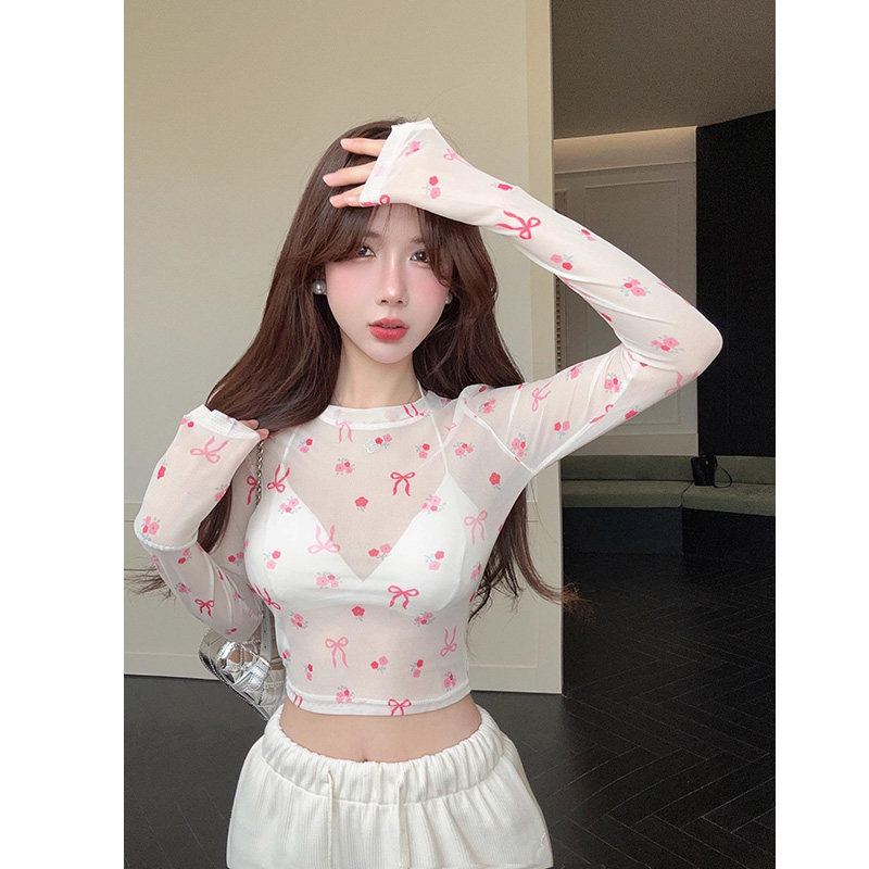 2025辣妹印花T恤女夏季性感圆领外搭网纱镂空防晒衣罩衫薄纱上衣
