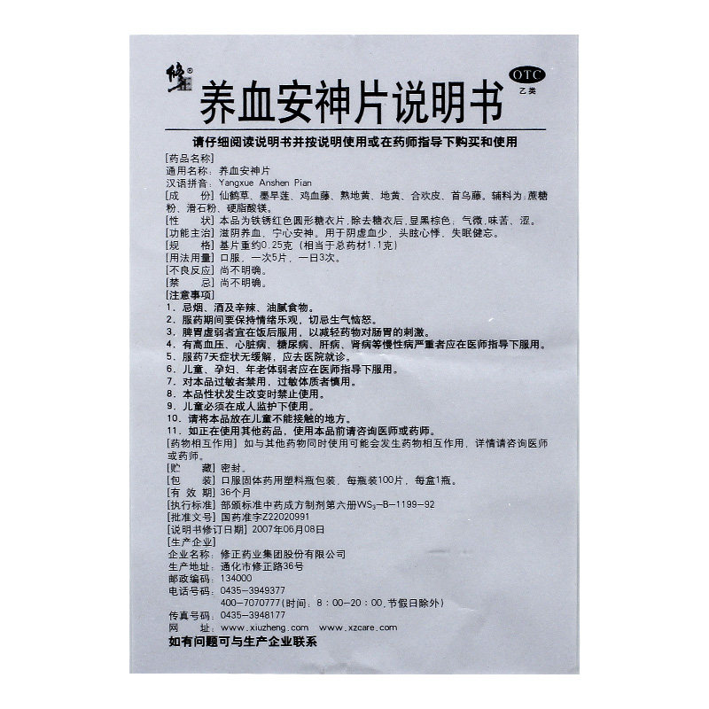 【修正】养血安神片250mg*100片/盒