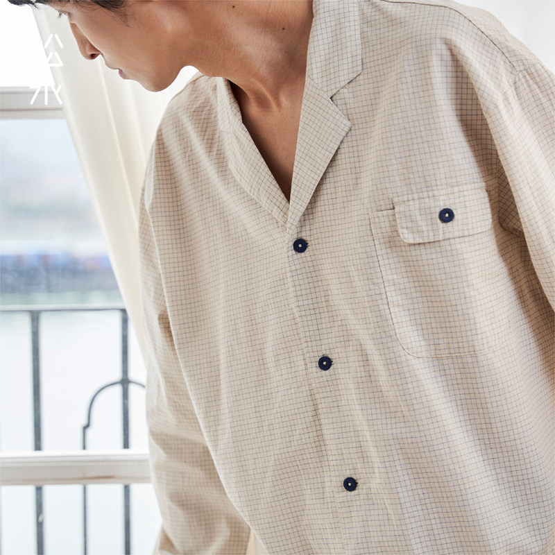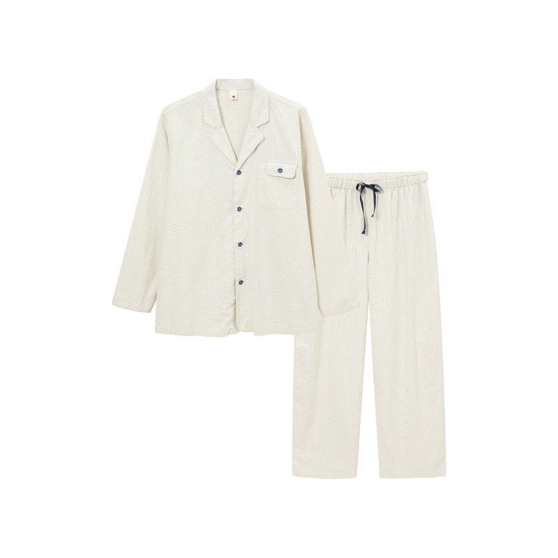松永新款春夏睡衣家居服棉+木棉长袖长裤男女同款舒适简约细格套