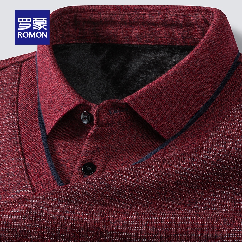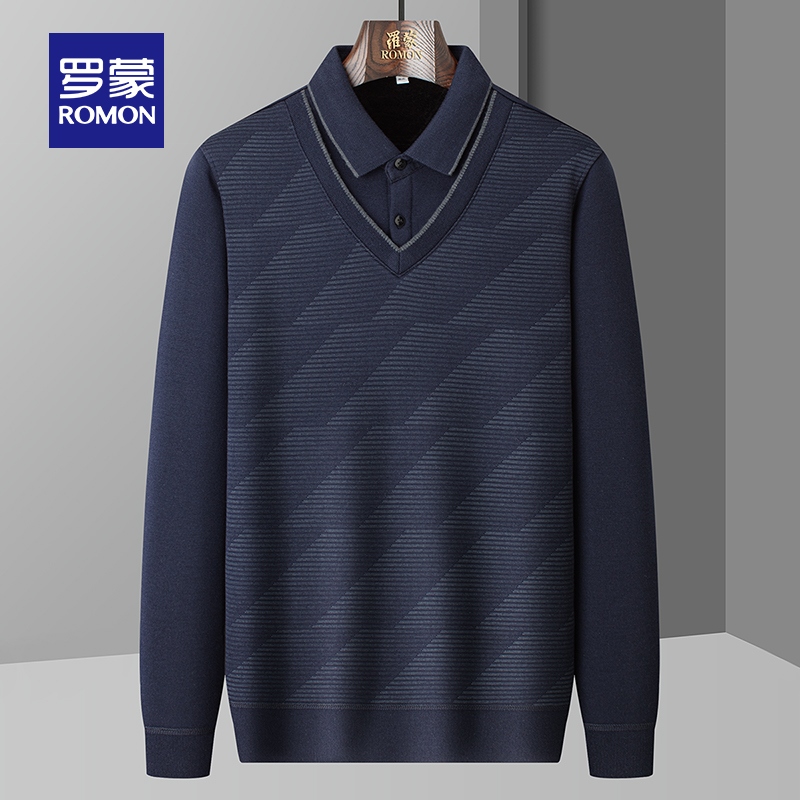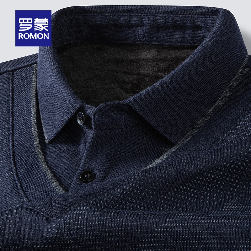 【含羊毛加绒保暖】罗蒙男士假两件针织衫2025冬季新款翻领毛衣男