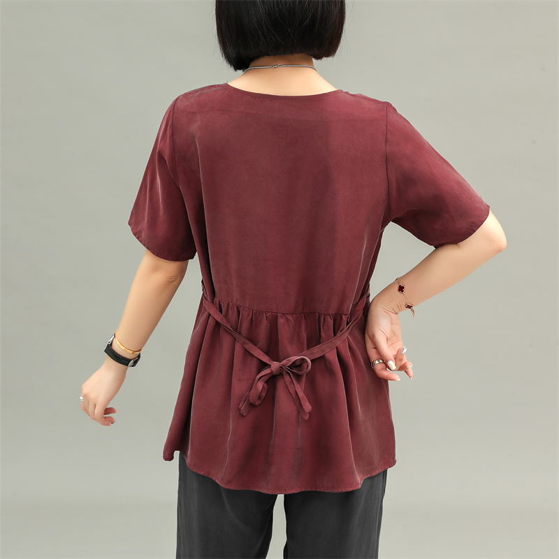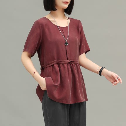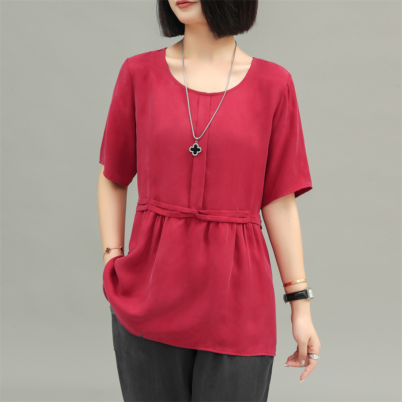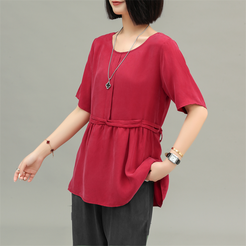 2025新款真丝铜氨丝上衣女夏季中长款显瘦遮肚子绑带短袖t恤女装