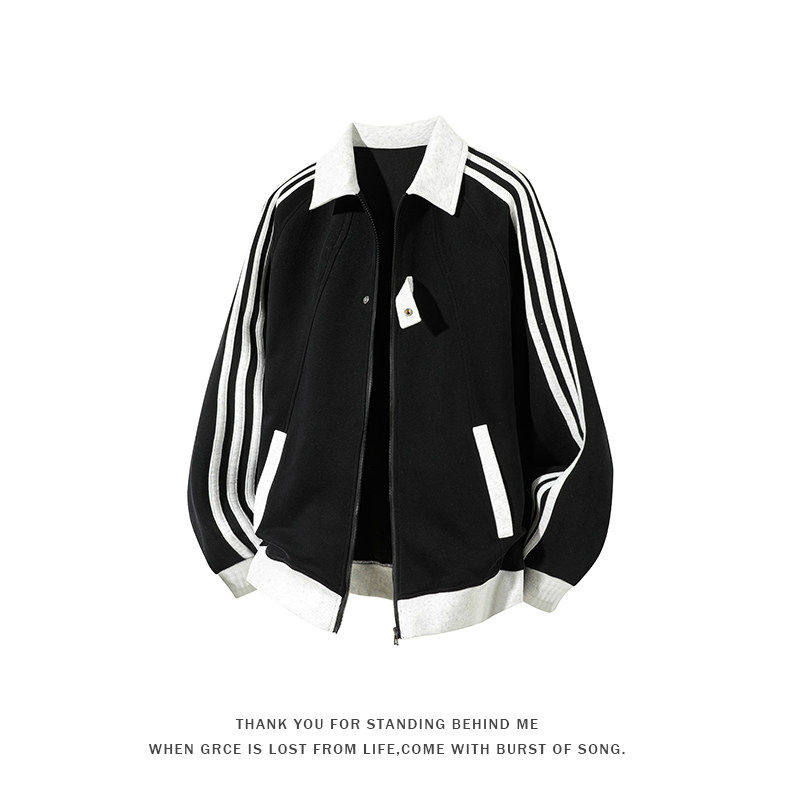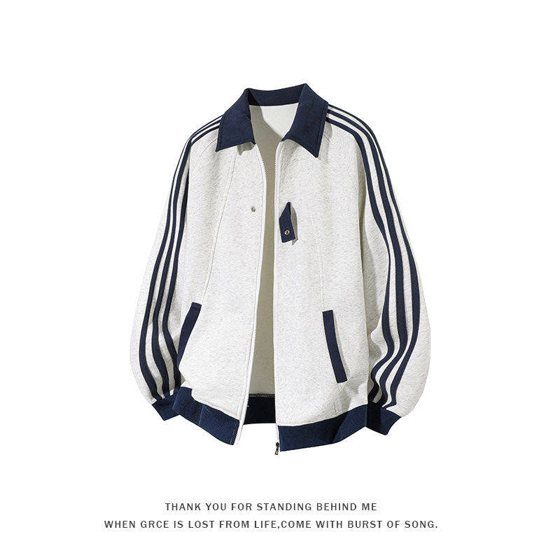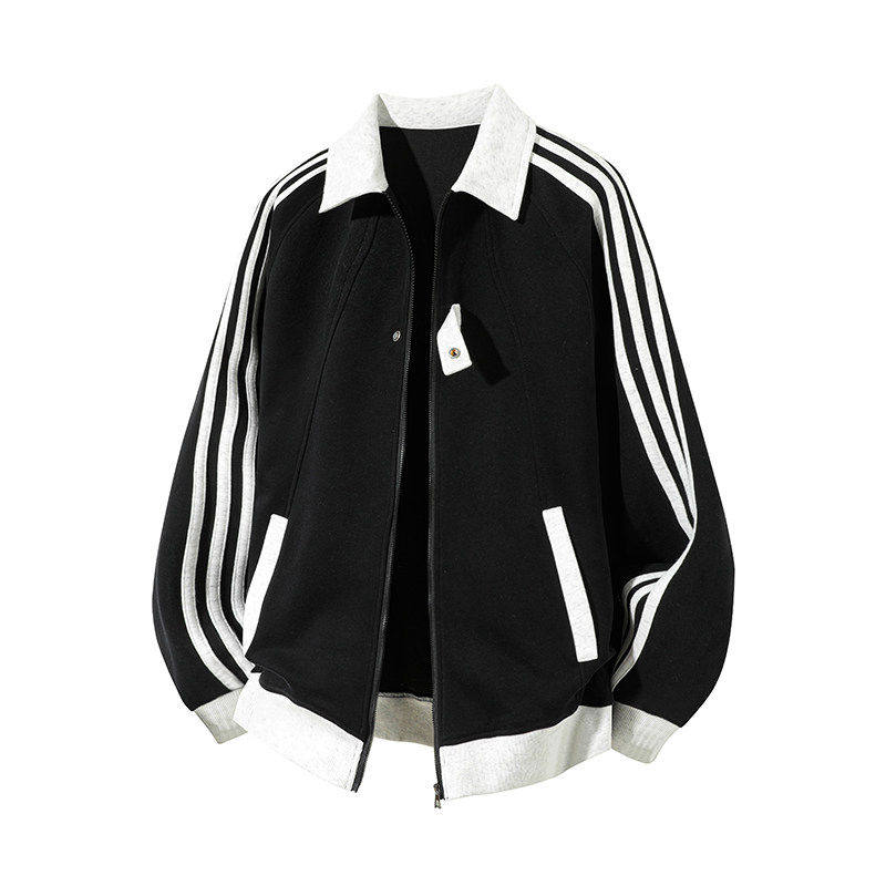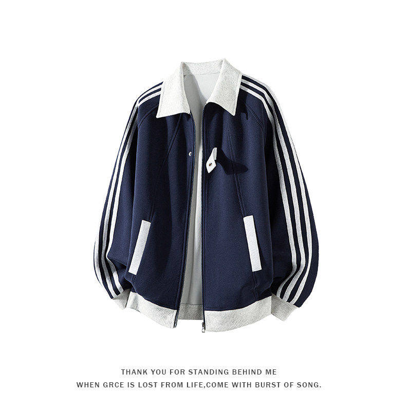复古运动风三条杠翻领开衫卫衣男宽松撞色休闲外套大码
