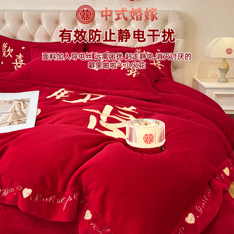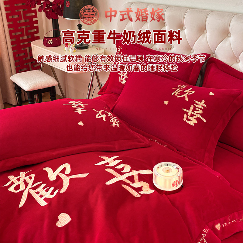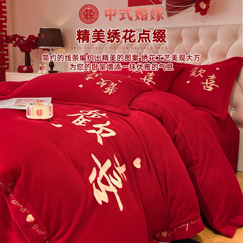 冬季高档中式刺绣牛奶绒四件套大红色珊瑚绒床单被套婚庆结婚床品