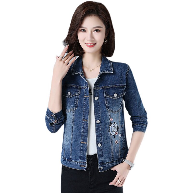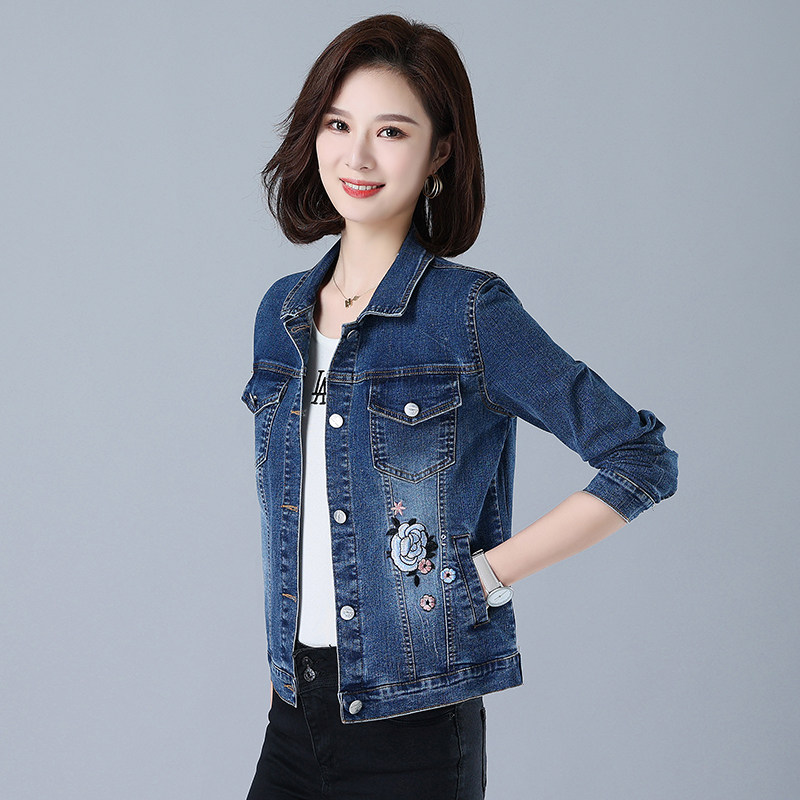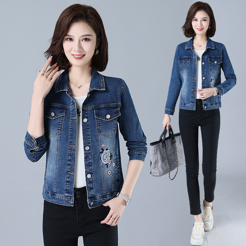 弹力牛仔外套女短款2024春季新款刺绣妈妈装牛仔衣修身小个子上衣