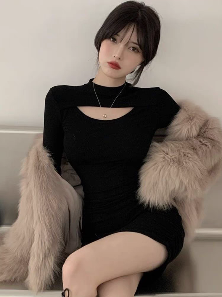 默谚馨长袖黑色镂空连衣裙子女2025秋冬装新款性感修身辣妹裙包臀