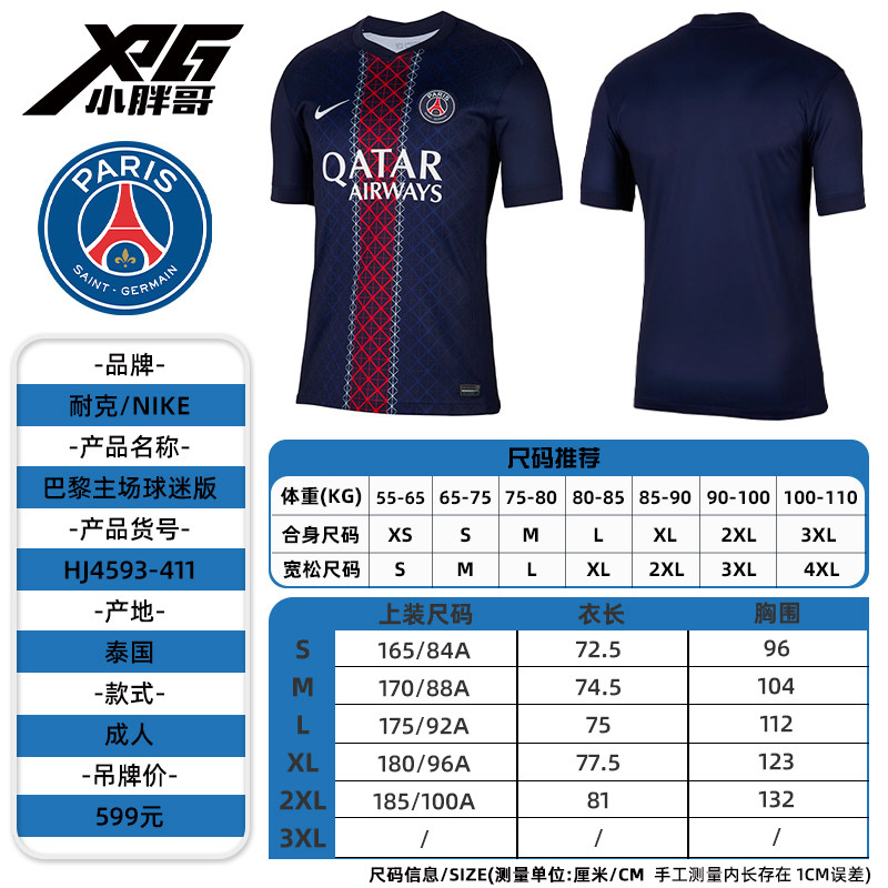 小胖哥XPG耐克25-26巴黎圣日耳曼主场球迷版球衣短袖足球服成人男