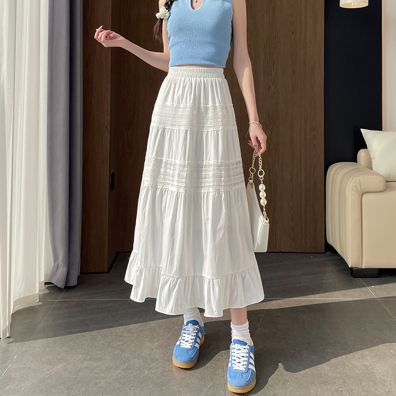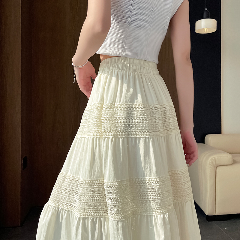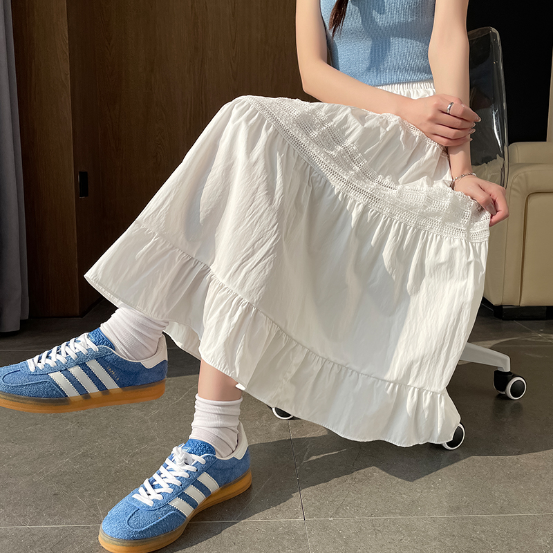白色蛋糕半身裙女春夏新款荷叶边大摆裙中长款镂空蕾丝拼接a字裙