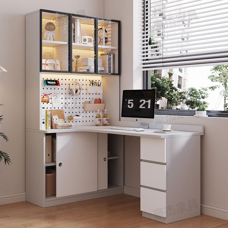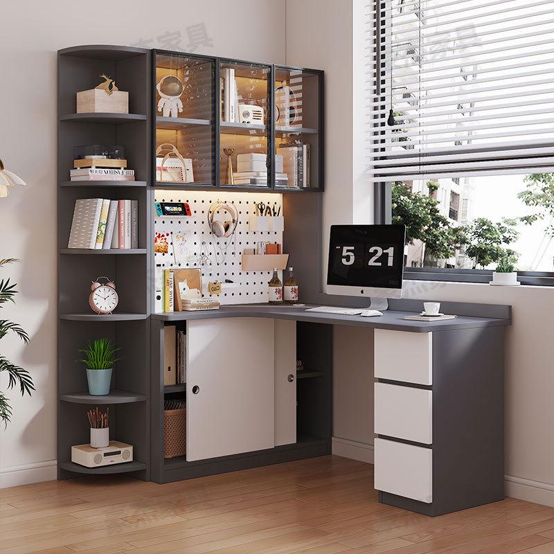实木转角书桌书架一体学生家用学习写字桌简约台式电脑桌书柜组合