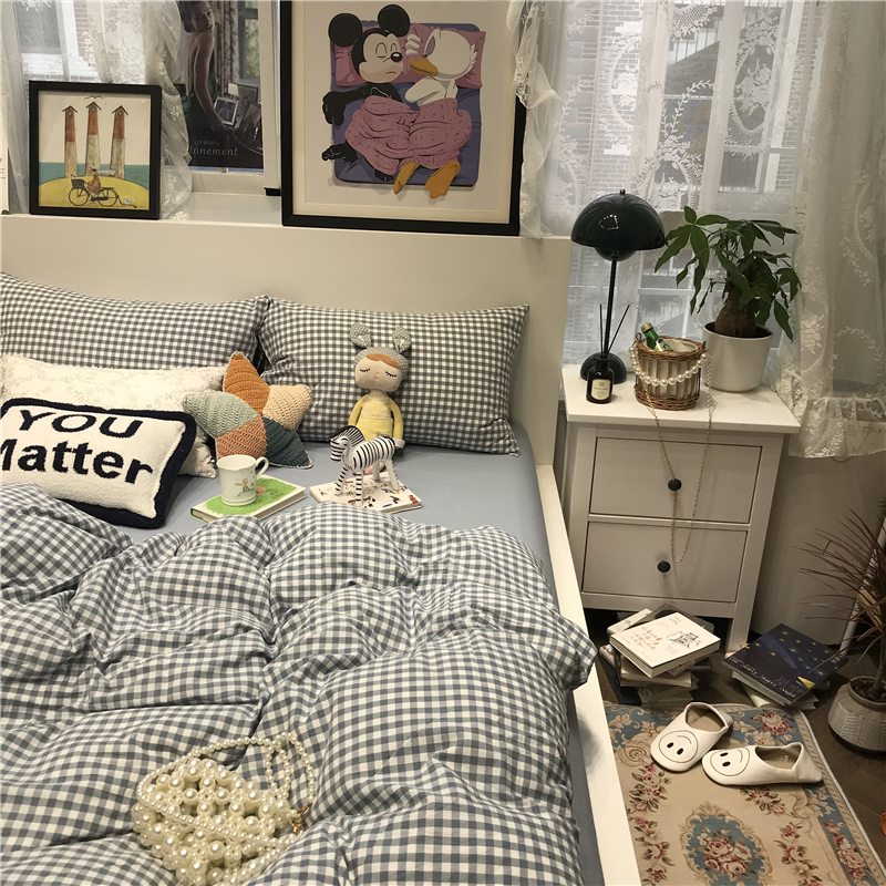 ins蓝色小格子少女心水洗棉床上四件套全棉纯棉被套学生公寓三件