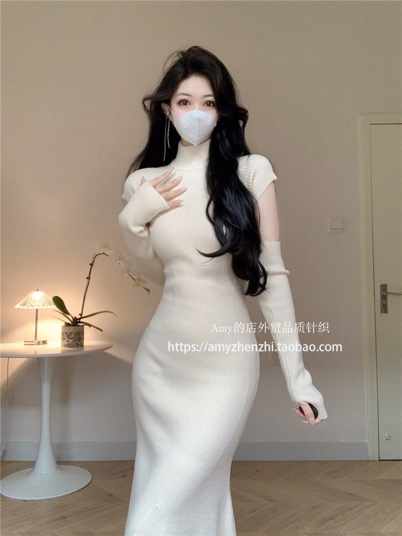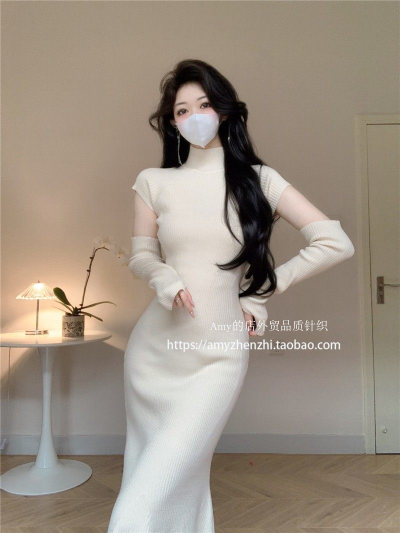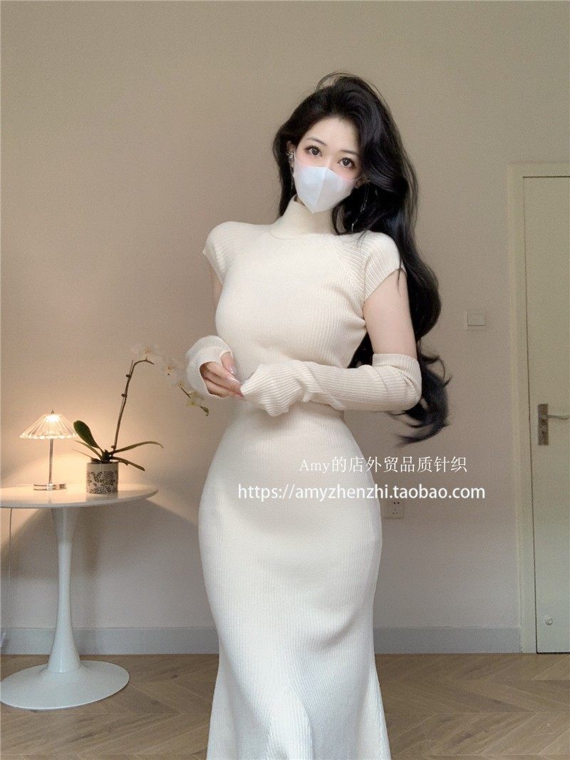 Amy的店外贸品质针织性感紧身连衣裙收腰褶皱气质袖套包臀鱼尾裙