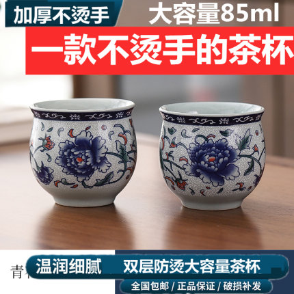 青花防烫双层品茗杯大容量茶杯功夫茶具茶杯套组单个主人杯耐高温
