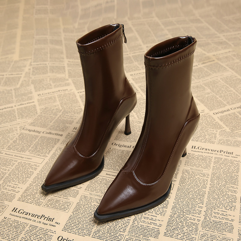 巨好看高跟细跟棕色短靴女2025秋