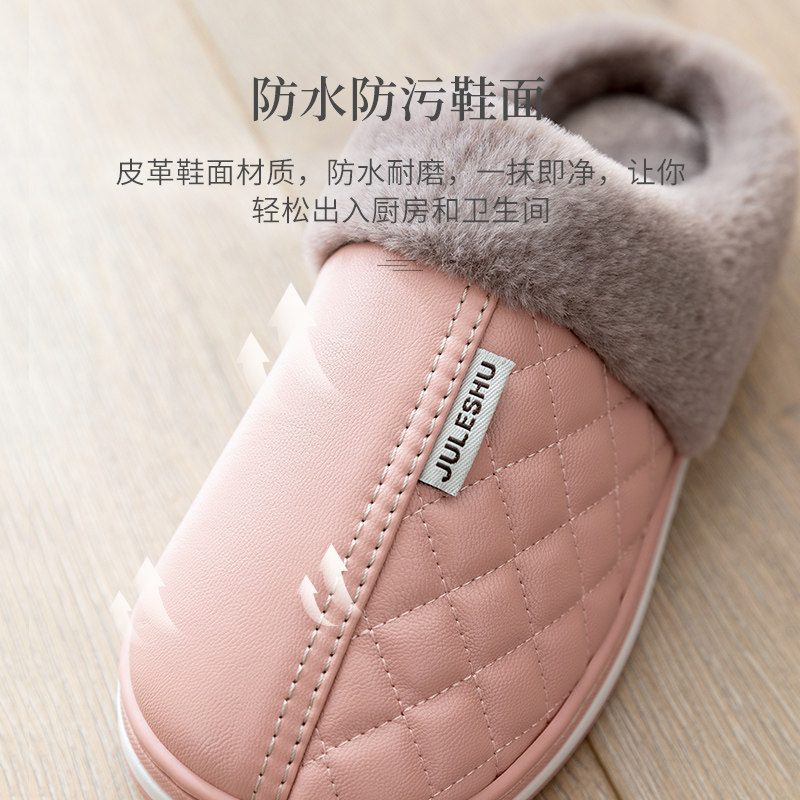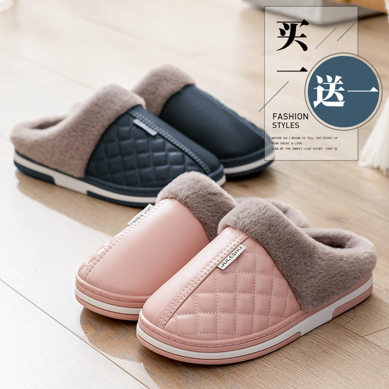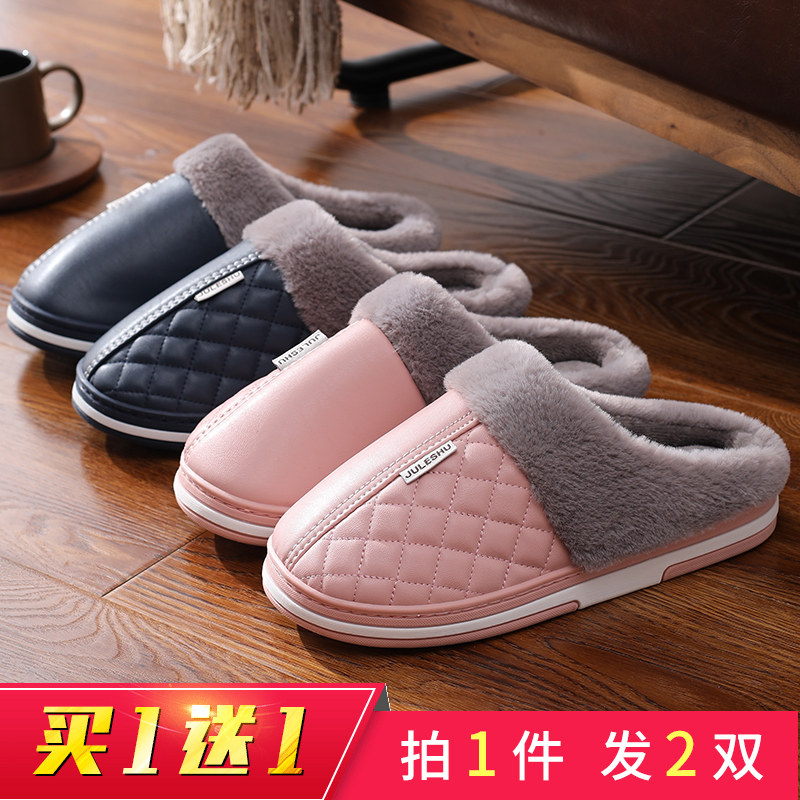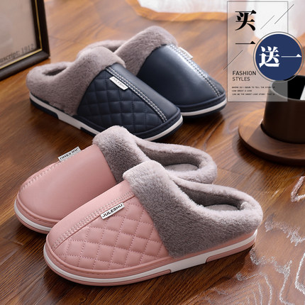 买一送一棉拖鞋女秋冬季室内家居保暖家用防滑情侣防水PU皮拖鞋男