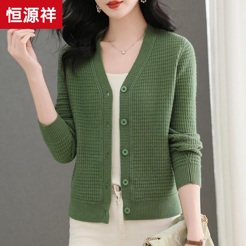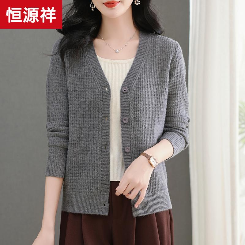 恒源祥羊毛衫女2025春秋新款安哥拉红色针织开衫妈妈短款毛衣外套