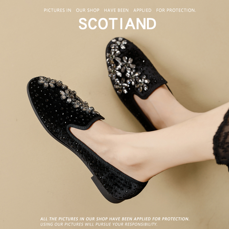 黑色单鞋女2025新款春季真皮百搭水钻丝绒气质感一脚蹬懒人豆豆鞋