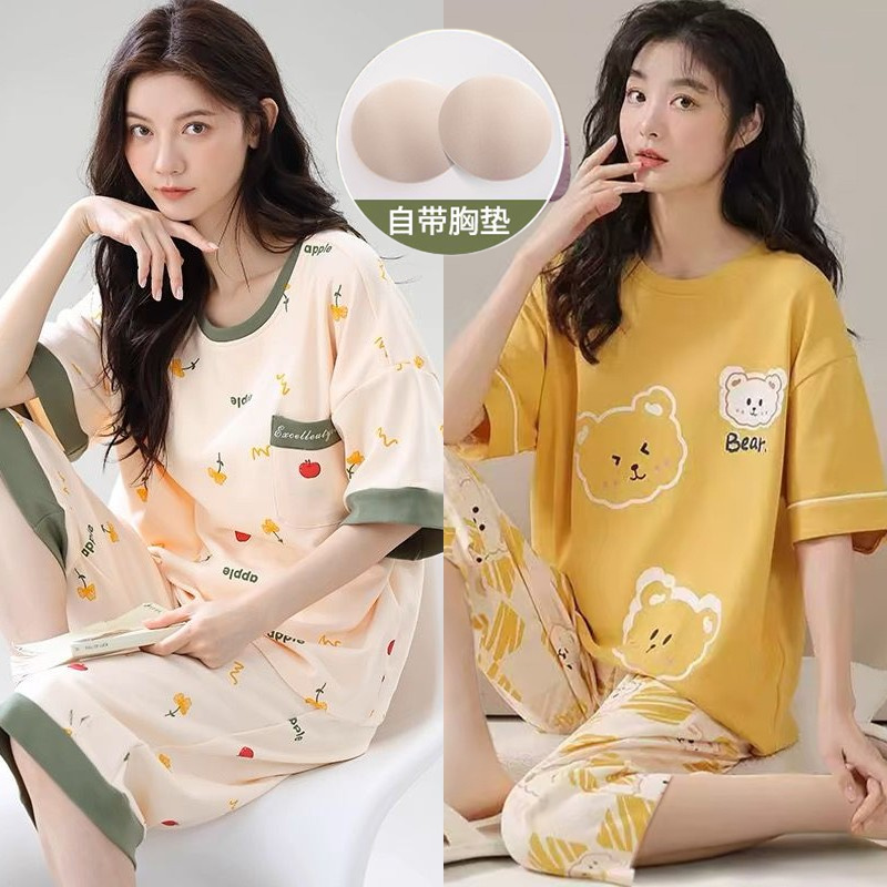 睡衣女夏季带胸垫一体2025新款短袖七分裤休闲甜美女士家居服套装