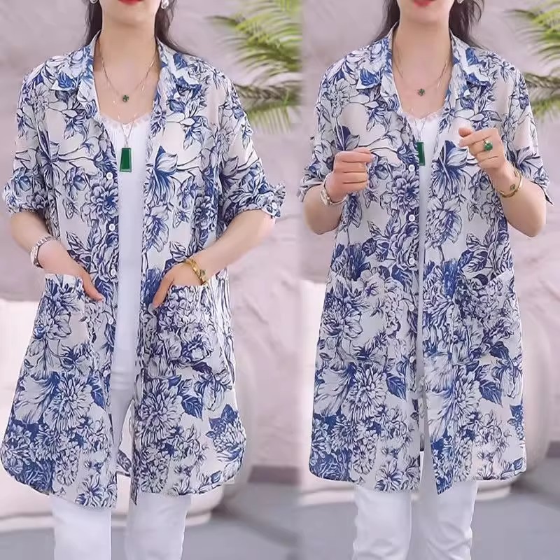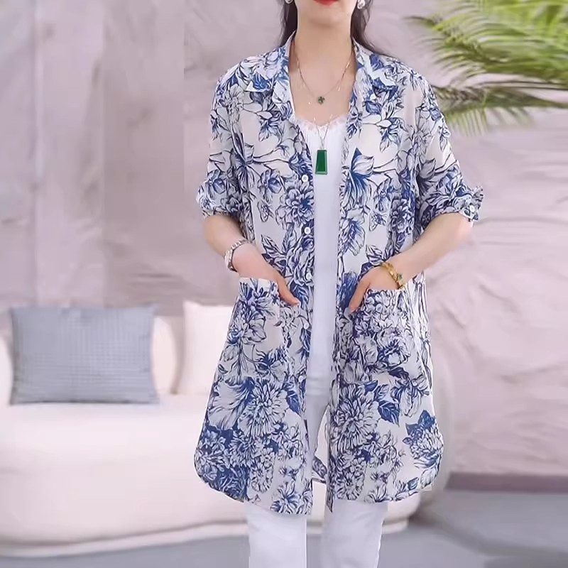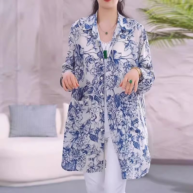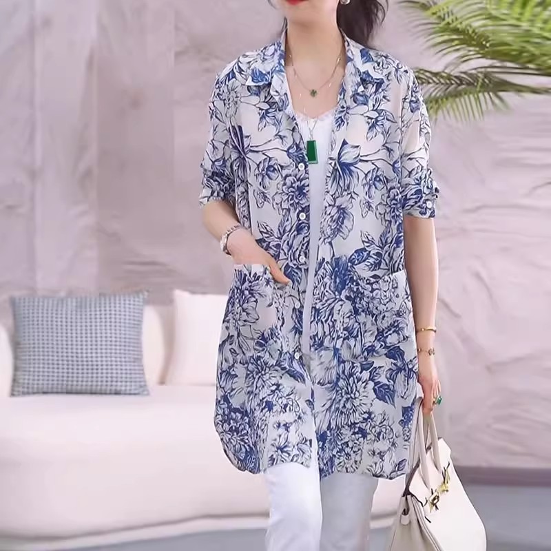 国风晕染青花瓷衬衫外套女2025春夏新款宽松显瘦中长款开衫防晒衣