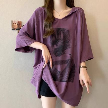 大码遮屁股短袖中长款t恤女夏季新款胖mm宽松遮肚子连帽上衣300斤