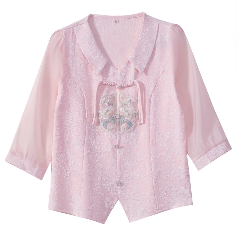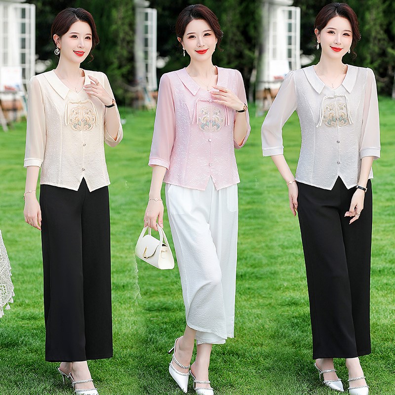 妈妈夏装2024新款国风衬衫时尚套装雪纺上衣中老年女秋装t恤小衫