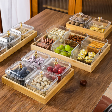 玻璃分格果盘带木托新中式家用干果零食盘客厅待客复古水果盘茶几