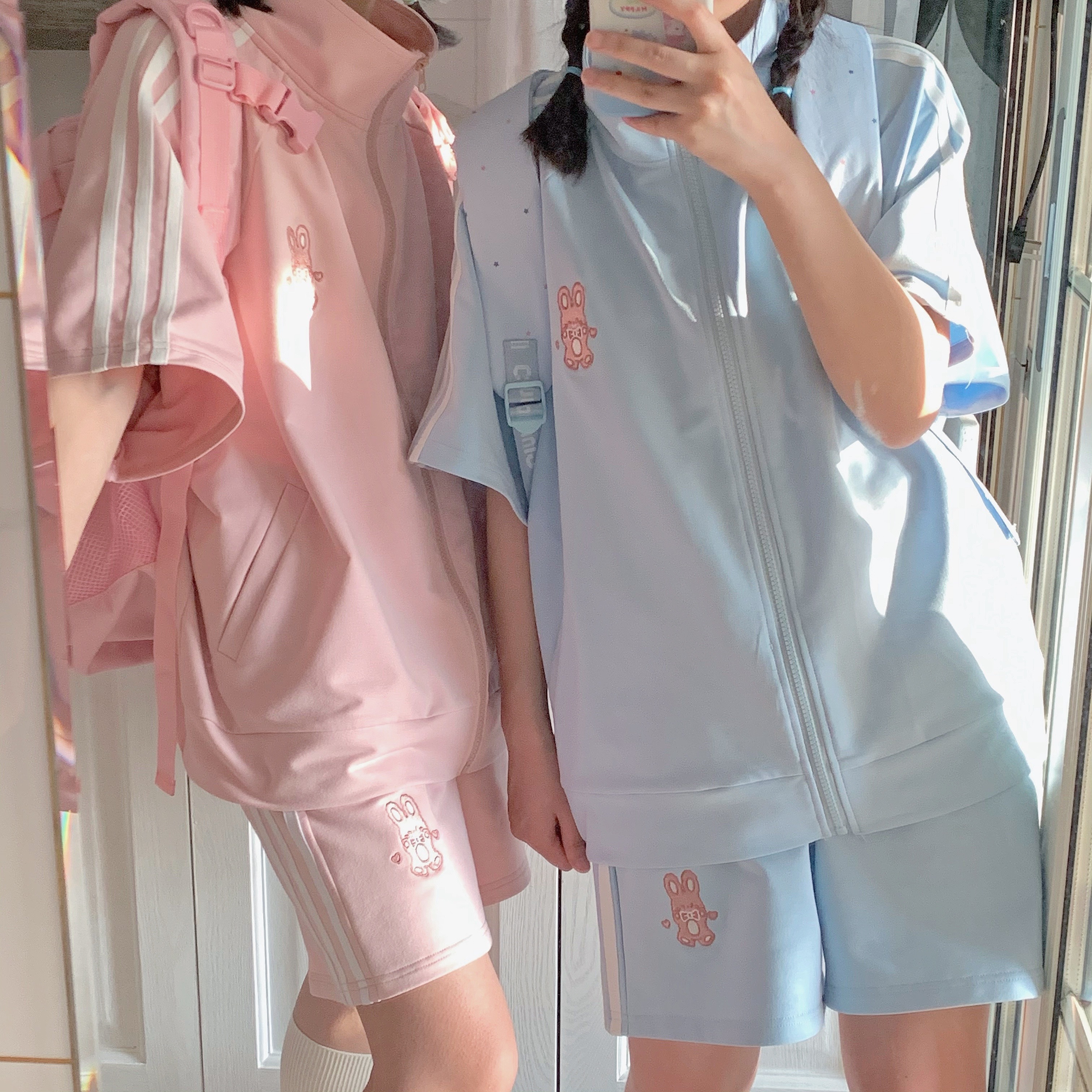 少女运动服套装女春秋学院风休闲宽松学生外套小个子粉色两件套潮