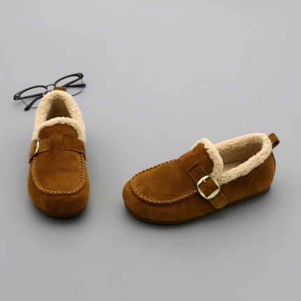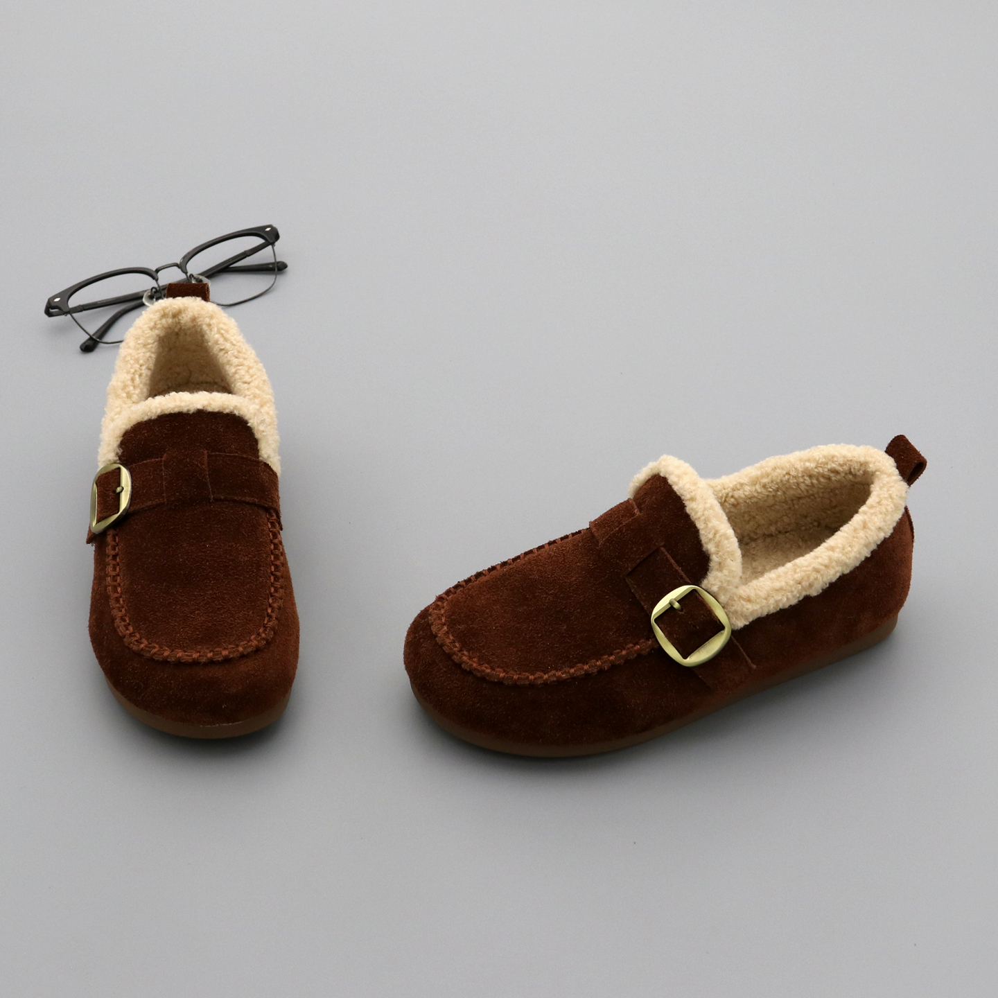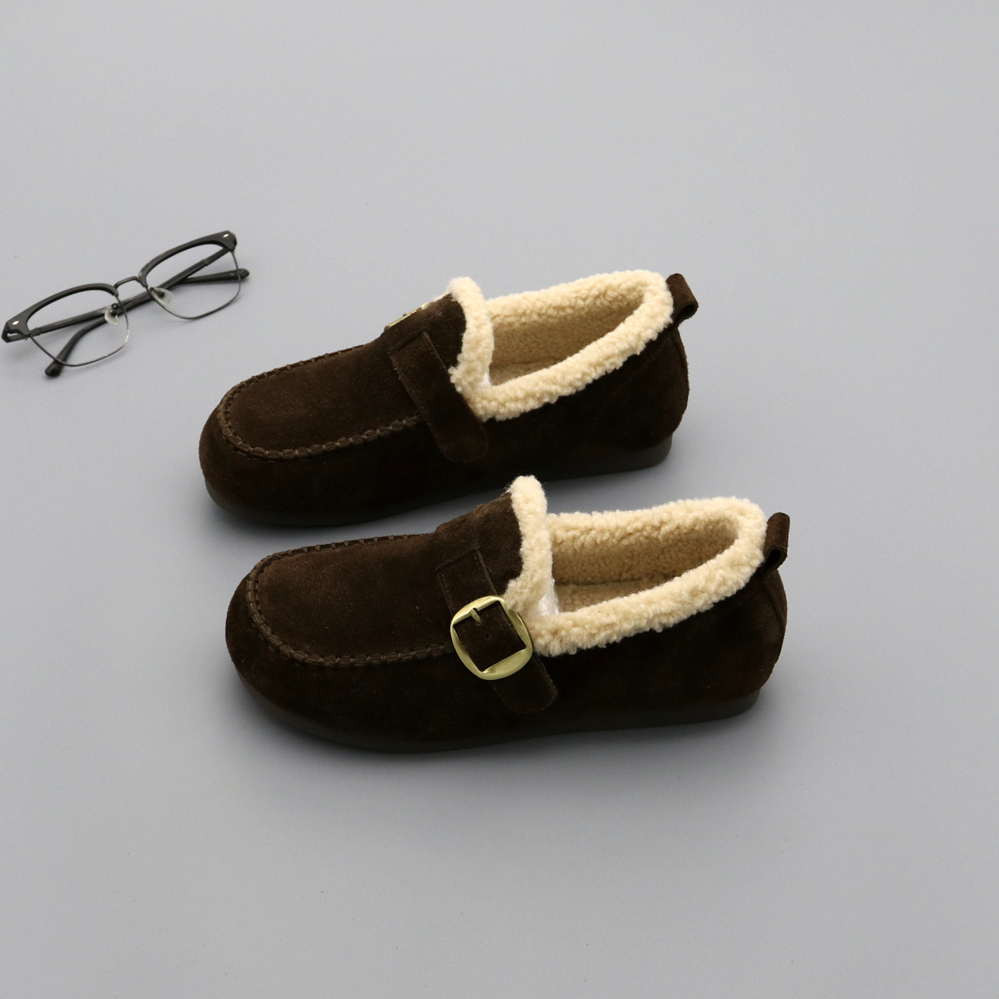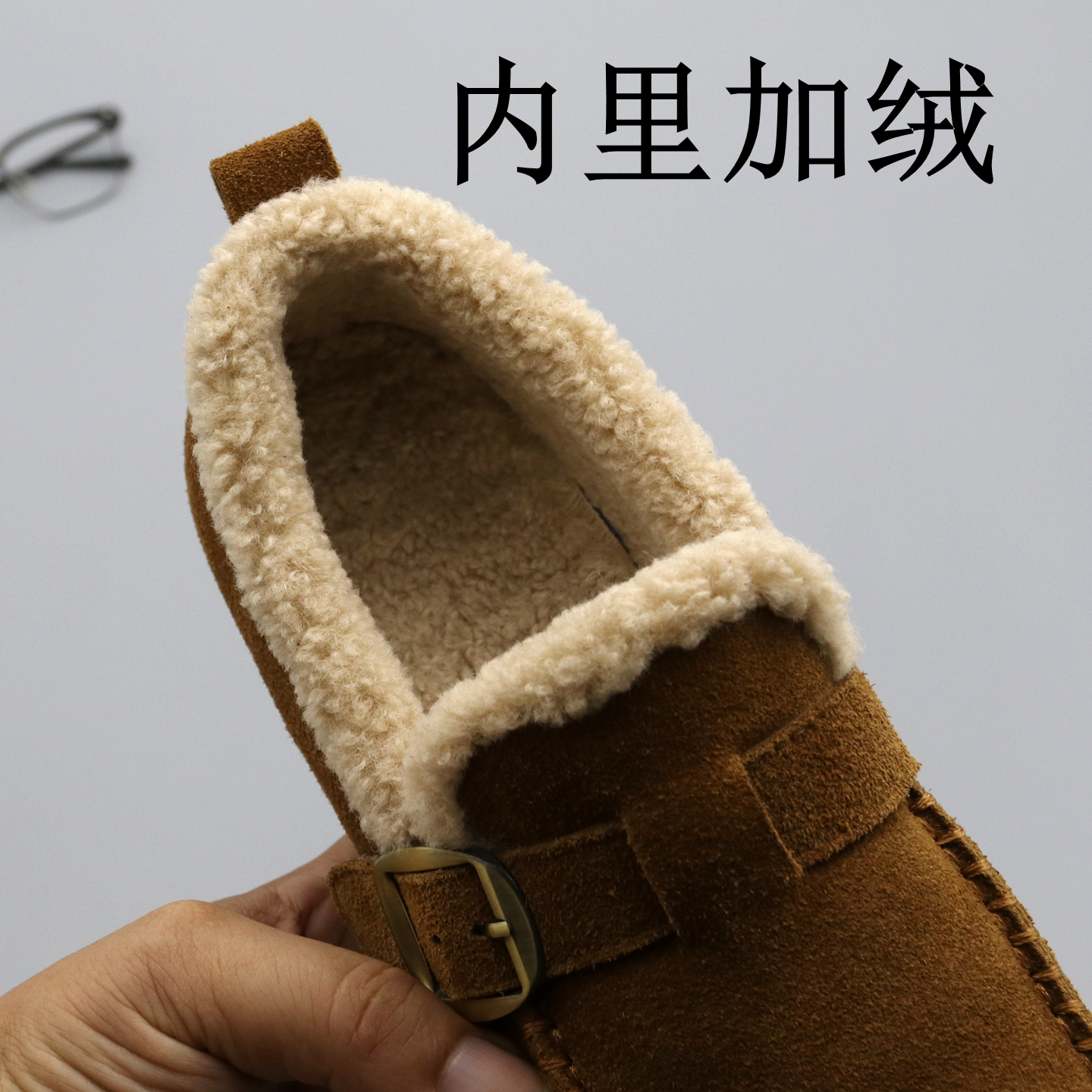 真皮勃肯鞋女棉鞋冬季圆头羊羔毛加绒平底毛毛鞋女一脚蹬豆豆鞋子