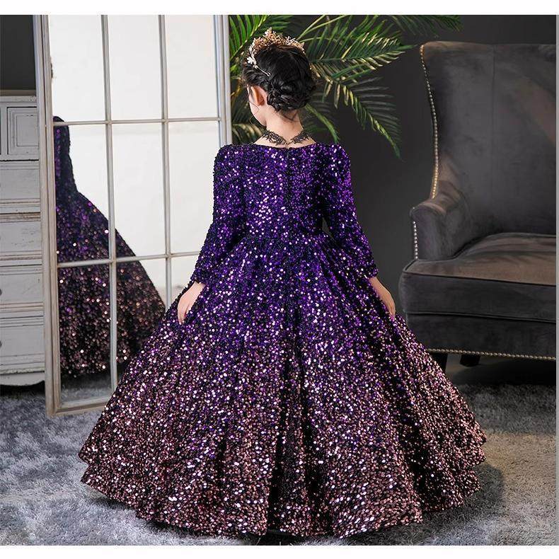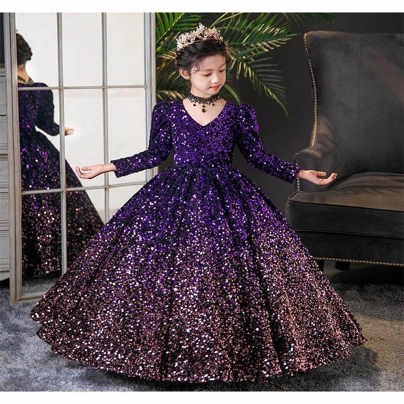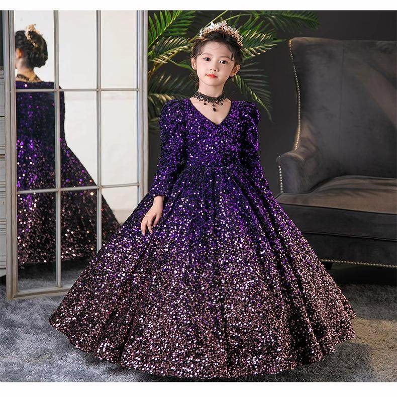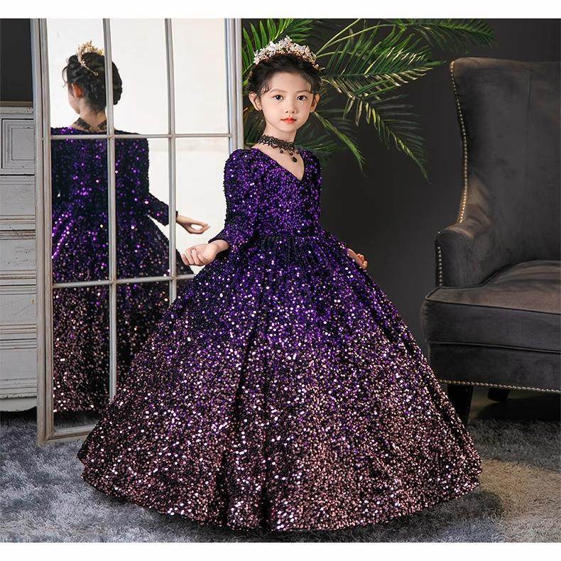 儿童生日礼服紫色亮片长袖公主裙女童走秀主持人高端演出服装秋冬